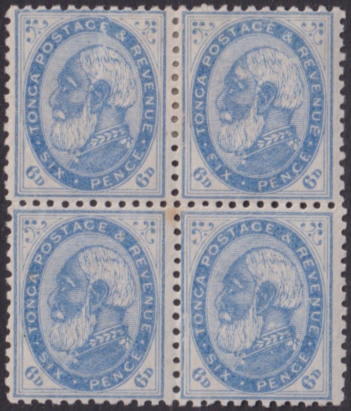 Tonga 1887 6d King George I blue block of 4, p12 x 11½, type 1 (normal), 1 with small tone spot. SG 3a. Cat £300. HH