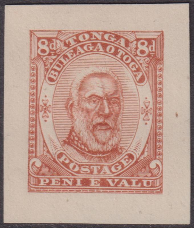 Tonga 1892 8d King George I, 25 x 20mm die proof in chestnut on unwmkdpaper. (Image)
