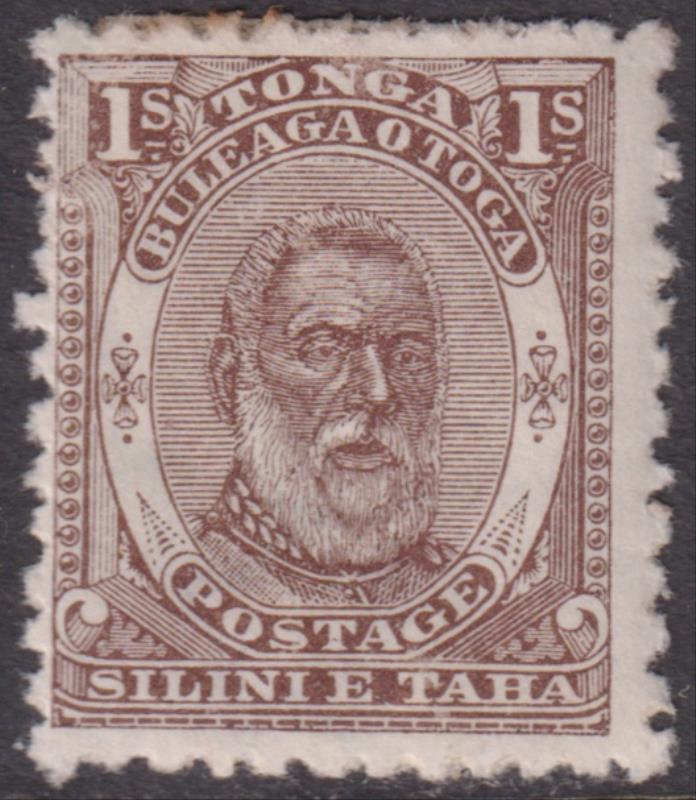 Tonga 1892 1/- King George I, p12 x 11½, with some orange ink adhesions on rear. SG 14. Cat £110. Mint. (Image)