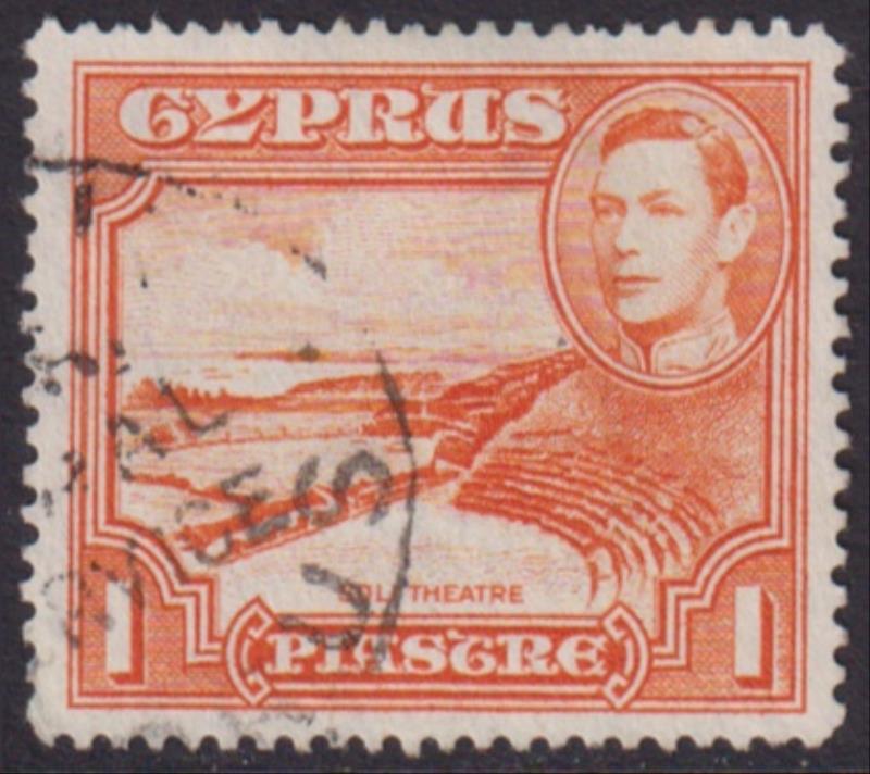 2832 U Cyprus 1944 1pi GV & Ancient Theatre orange x 2, scarce p13½ x 12½ VFU. Also normal 1pi p12½ FU. SG 154, 154a. Cat £32.40.