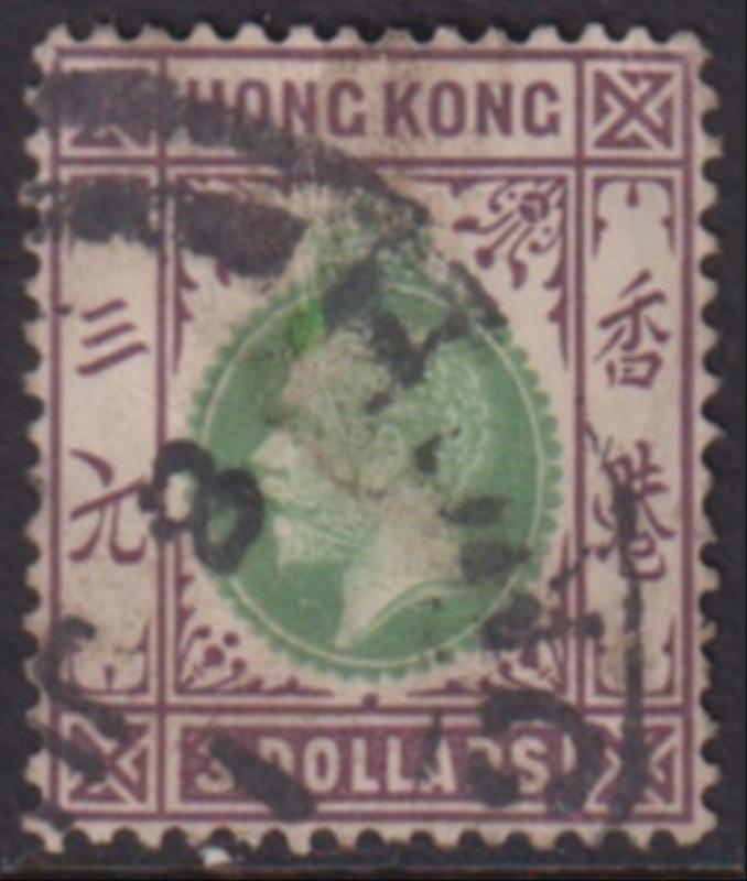 Hong Kong 1926 $3 GVI green & dull purple, mult script CA wmk, light crease. SG 131. Cat £85. FU. (Image)