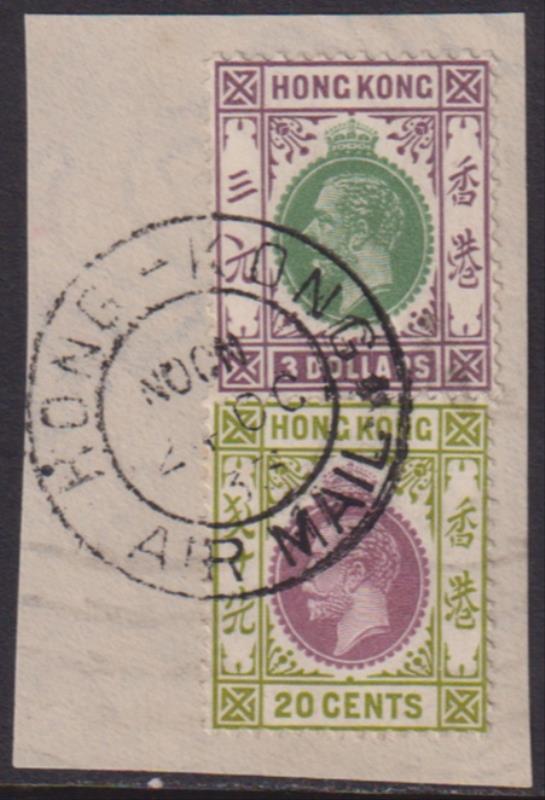 Hong Kong 1926 $3 GV green & dull purple (& also 20c GV), on piece with 24 Oct 1933 HK Airmail cds. SG 131. Cat £85+. FU. (Image)
