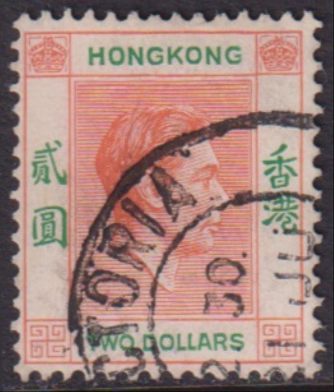 Hong Kong 1938 $2 GVI red-orange & green. SG 157. Cat £45. GU/FU. (Image)