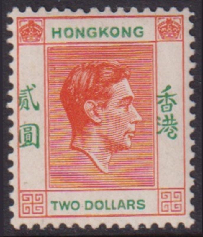 Hong Kong 1938 $2 GVI red-orange & green. SG 157. Cat £80. VLH mint. (Image)