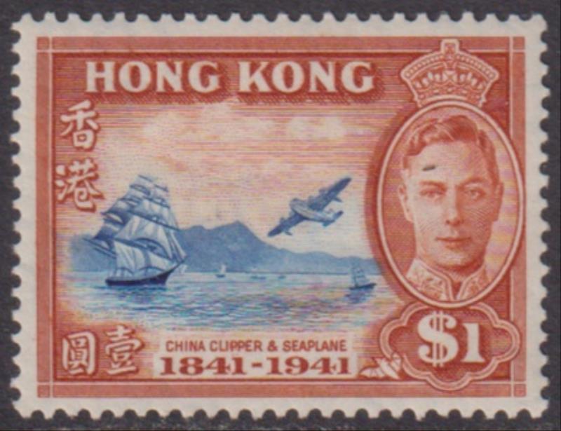 Hong Kong 1941 $1 Cent of British Occupation blue & orange (sailing ship & aeroplane over harbour). SG 168. Cat £50. LH