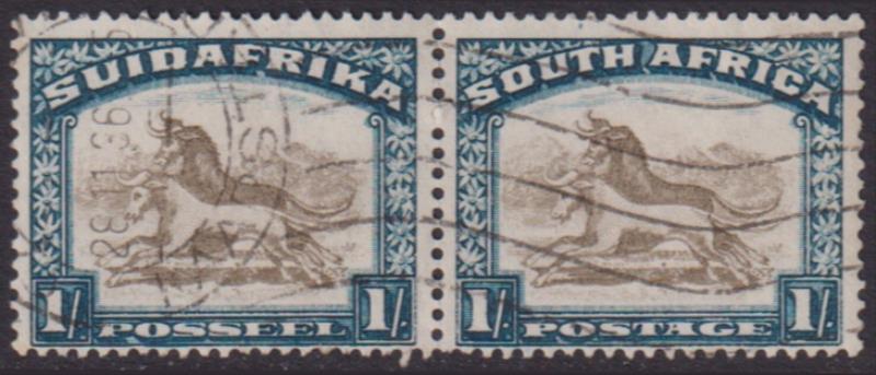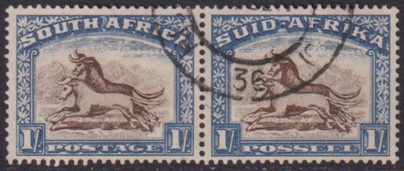 3085 U imageSouth Africa 1932 1/- Gnus horiz bilingual pair, invtd wmk. SG 49cw. Cat £26. FU. (Image)