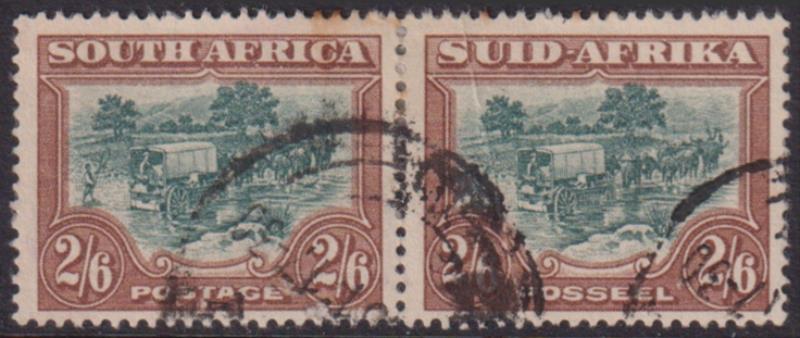 3088 U imageSouth Africa 1949 2/6d Ox-wagon green & brown bilingual horiz pair (rotogravure). SG 121. Cat £30. FU. (Image)