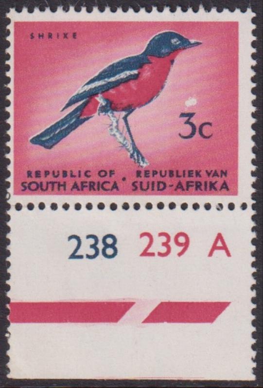 3092 * imageSouth Africa 1967 3c Shrike with large white void above 3c, with lower selvedge & cylinder numbers. SG B243 var. MUH. (Image)