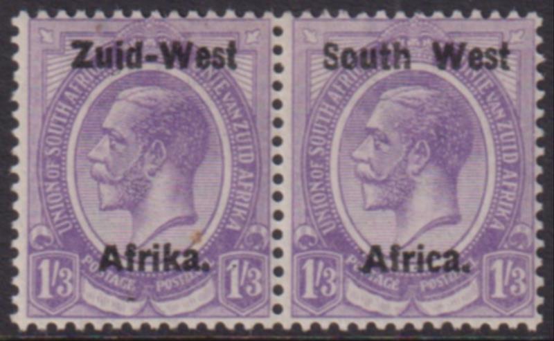 3097 M imageSouth West Africa 1923 1/3d EVII bilingual horiz pair ("Zuid-West"). SG 8. Cat £45. Mint. (Image)