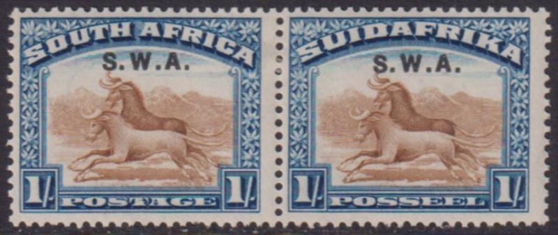 3100 M imageSouth West Africa 1927 1/- Wildebeest horiz bilingual pair, p14 x 13½. SG 64b. Cat £65. Mint. (Image)