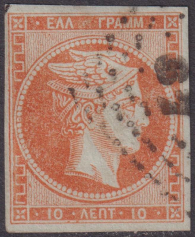 3298 U imageGreece 1861 10L Hermes Head orange on blue paper, imperf (4 margins), #67 within lozenge cancel. SG 19b. Cat £85. (Image)