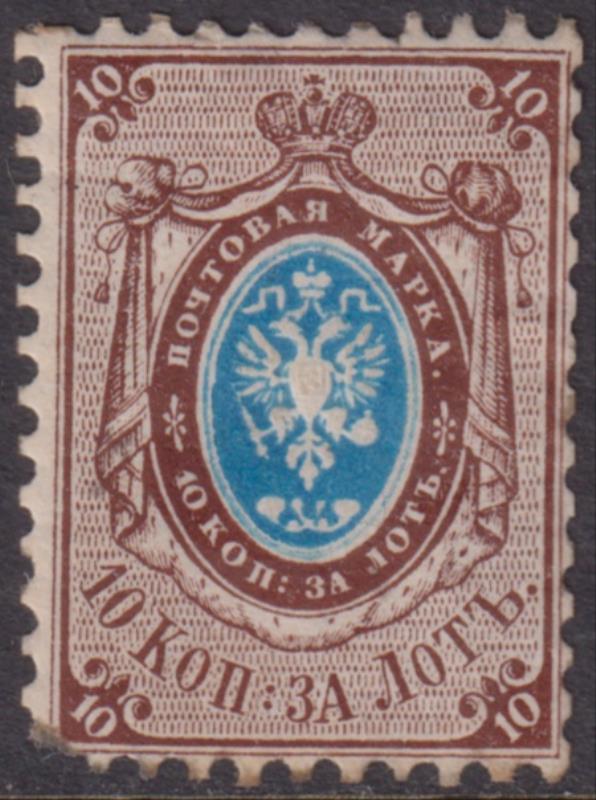 3443 M imageRussia 1858 10K blue & brown, p12½, no wmk, corner perf missing. SG 5. Cat £450. Mint. (Image)