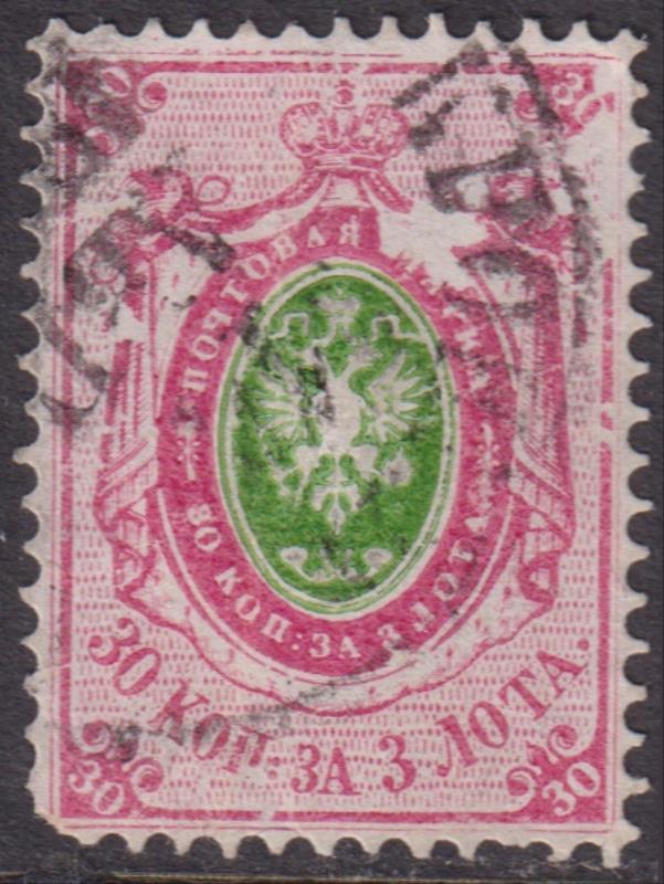 3445 U imageRussia 1866-75 30K green & carmine, p14½ x 15, crinkling on reverse & minor surface disturbance. SG 29. Cat £250. FU. (Image)