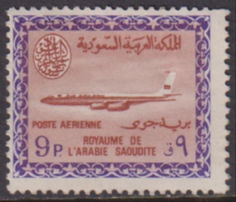 3459 M imageSaudi Arabia 1964 9p Air, King Saud Cartouche red-brown & violet, 2nd type airliner. SG 594. Cat £140. Mint (disturbed gum). (Image)