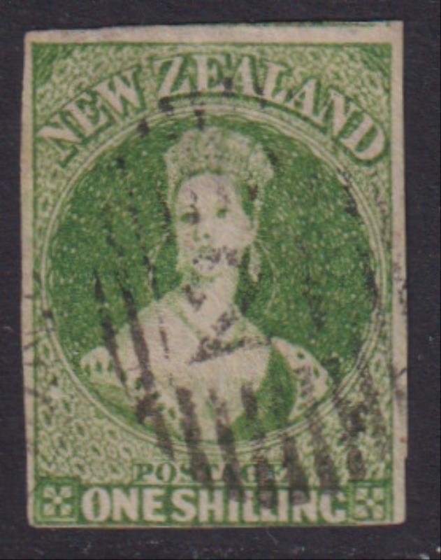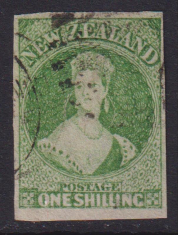FFQ 1/- green, imperf 4 margins, NZ wmk, Otago pmk. SG 100. Cat £475. GU.