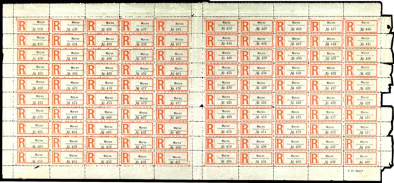 Lot 1609 - Registration label "Maron", complete sheet N° 401-500 with printers mark "C 35 page 3", Unnoticed historic condindional Fold and age traces very fine, grand piece of this small postal service institute, the only from 1910 - 1914 inventory.