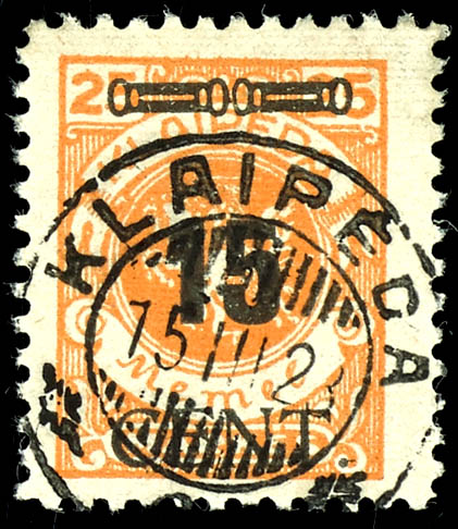 15 Cent on 25 Mark, vivid reddish-orange, cancelled \KLAIPEDA * c * 15. III. 23\, flawless condition, unsigned, photo certificate Tobias Huylmans BPP (2025) \genuine and flawless\. (190) Certificate 15 Cent auf 25 Mark lebhaftrötlichorange, entwertet \KLAIPEDA * c * 15.III.23\, tadellose Erhaltung, unsigniert, Fotoattest Tobias