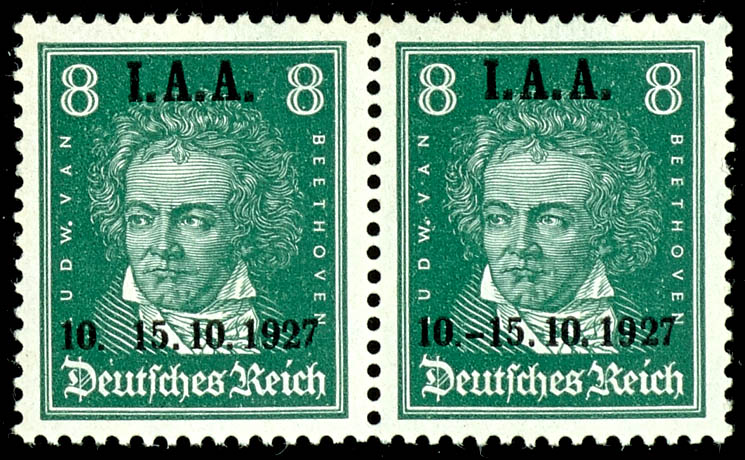 the reverse. (407I, 407) 8 Pfennig \Tagung des Internationalen Arbeitsamtes\, Plattenfehler I \ohne Bindestrich zwischen 10. und 15.\, postfrisch, tadellose Erhaltung, waagerechtes Paar mit anhängender Normalmarke, rückseitig herstellungsbedingt