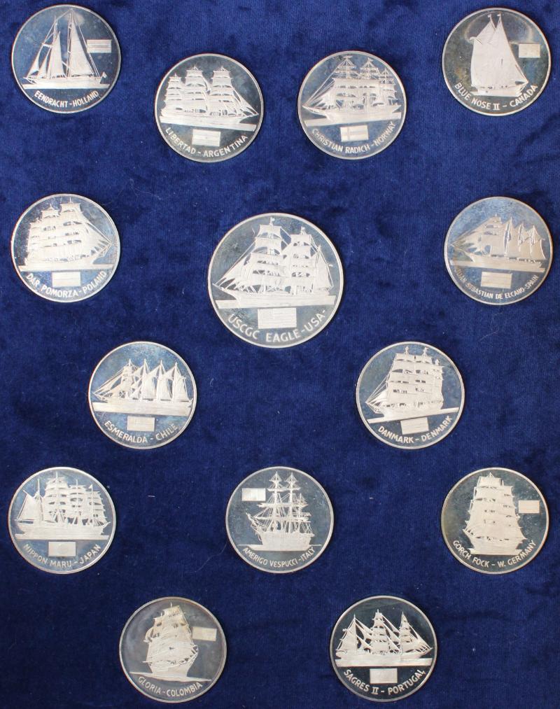 321 image Operation Sail 1976 boxed set of (14) 1-ounce sterling silver medals w/ various national ships represented at the US Bicentennial event, plus a 2-ounce sterling medal for the American ship USCGC Eagle; w/ paper numbered 501; Only (1,000) sets were sold in the U.S. (Image) (imageb) (All Images)