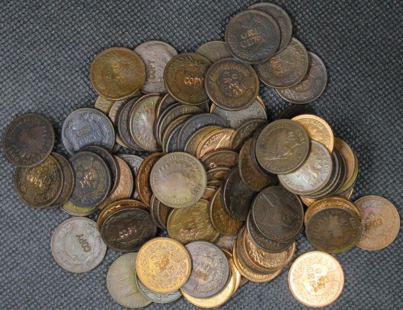 323 image Abt (100) replicas of Flying Eagle and Indian Cents all marked "COPY" and not intended to deceive prospective buyers. Quality imitations, incl many rarities in the series like 1856, 1877, & 1909-S. (Image)