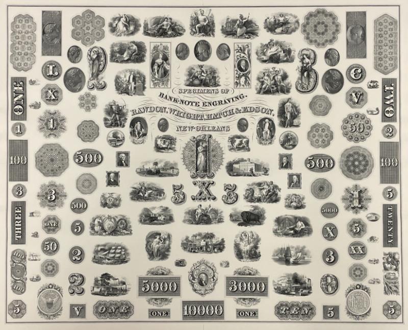330 image Attractive engraved display "Specimens of Bank-Note Engraving. Rawdon, Wright, Hatch & Edson, New-Orelans"; selections of various numerals, designs & vignettes for pre-Civil war obsolete notes, checks & stock certificates, reproduced by the ABNCo in the 1970s from a plate, likely used as a sales sampler for the company's New Orleans office; sunk on card measuring abt 28x23"; the company was one of several that joined to form the ABNCo, they also won the contract to print the first U.S. postage stamps in 1847; XF in frame. (Image)