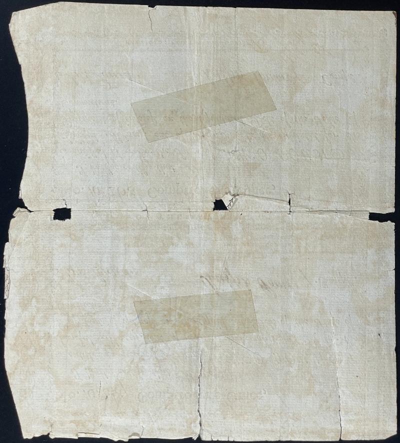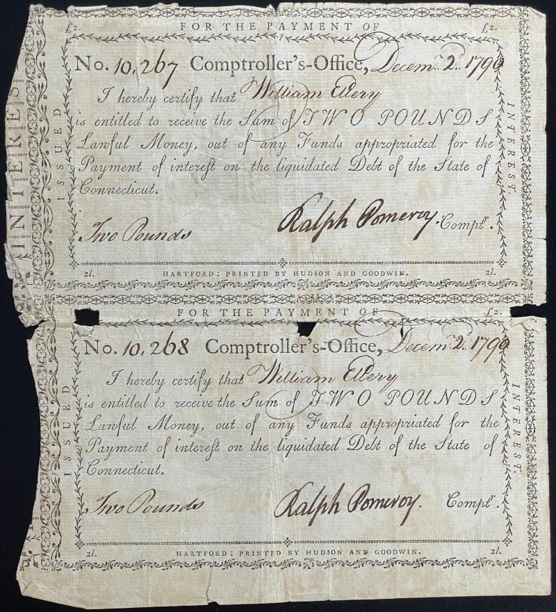 331 image 1790 Vertical pair of State of Connecticut interest payment coupons, both for "Two Pounds Lawful Money" and signed by state controller Ralph Pomeroy; slit cancels, printed by Hudson and Goodwin of Hartford, typical worn condition & faults; less common as pairs (Image) (imageb) (All Images)