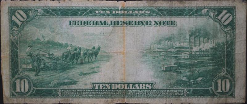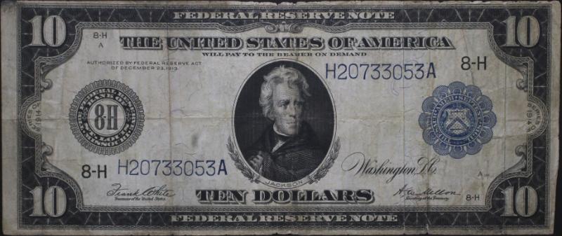 333 image 1914 $10 FRN (St L) Blue Seal F-935 S/N H20733053A abt F by wear, clean for the grade and well-centered, w/ some light feathering at top margin. (Image) (imageb) (All Images)