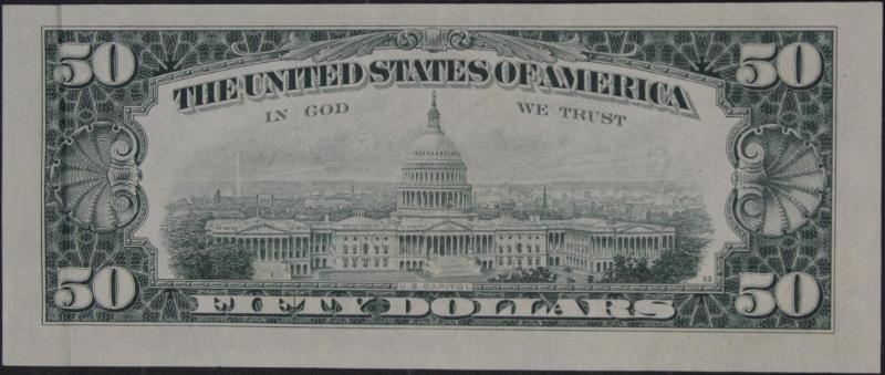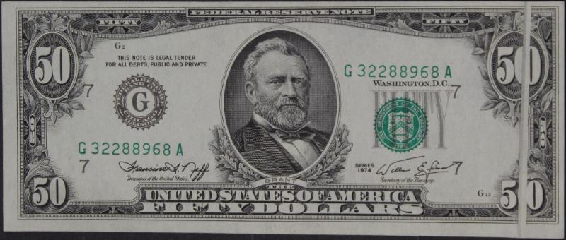 335 image 1974 $50 FRN(Chi) AU58 w/ a gutter-fold error through the denomination on the face. The error is interesting because it appears on the face but not on the back indicating that the fold in the paper occurred between the 1st and 2nd printings of the note. (Intaglio notes actually have three printings in their manufacture. The 1st one prints the back, the 2nd the front, and the 3rd prints the serial numbers, the Treasury seal, and the Federal Reserve bank. The present note had a clean 1st printing, but then incurred a paper fold causing the 2nd printing to show the error.) See the pic! (Image) (imageb) (All Images)