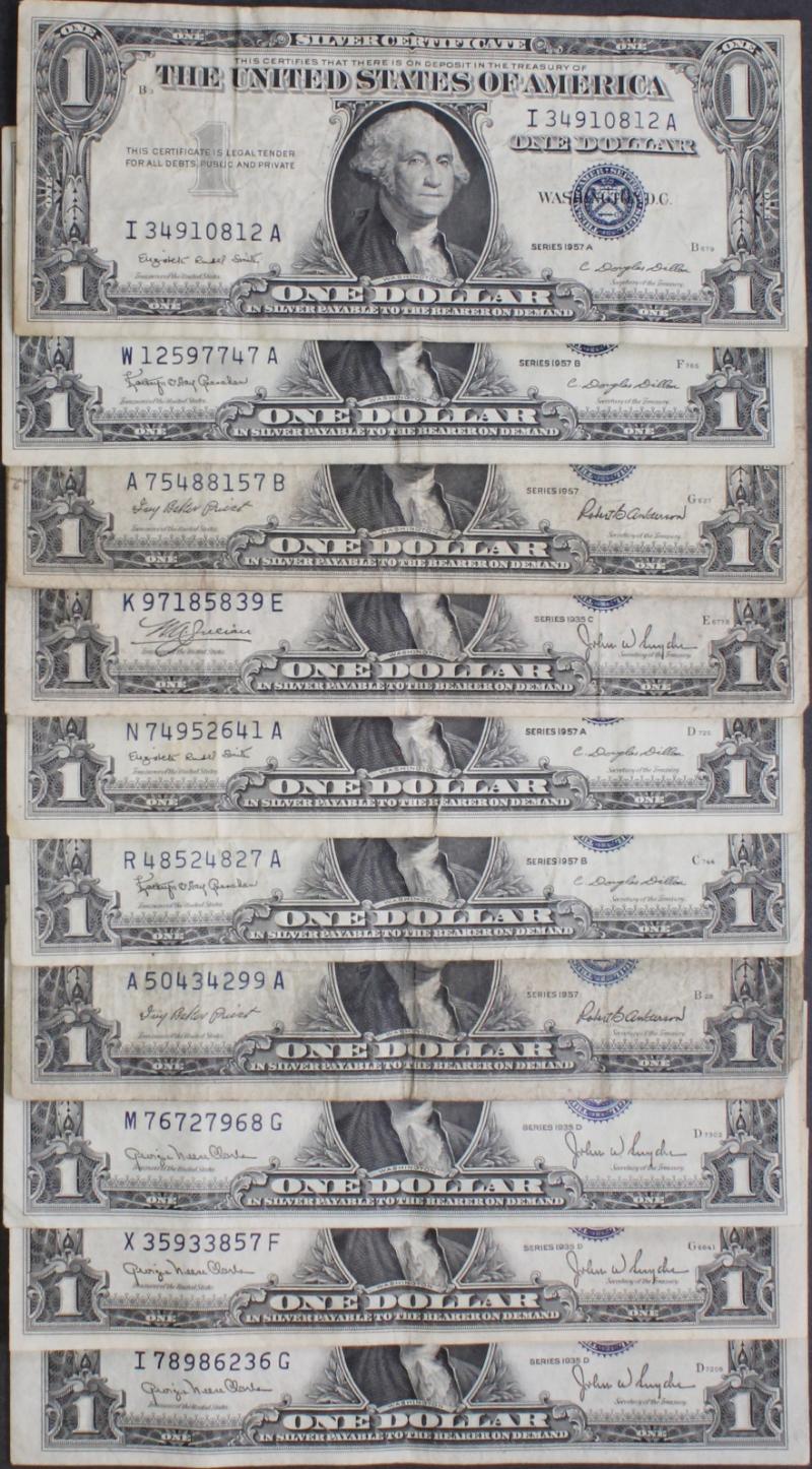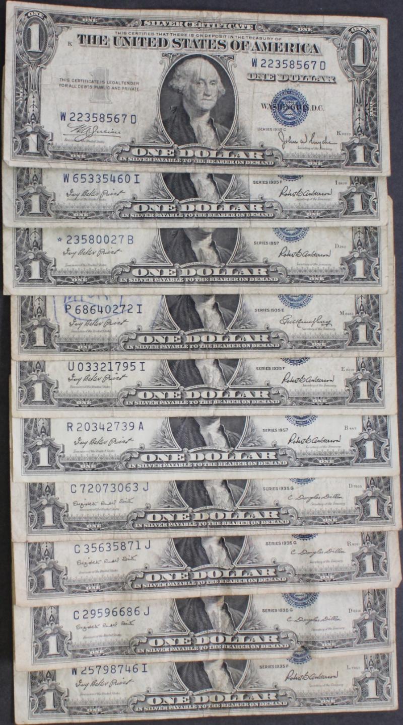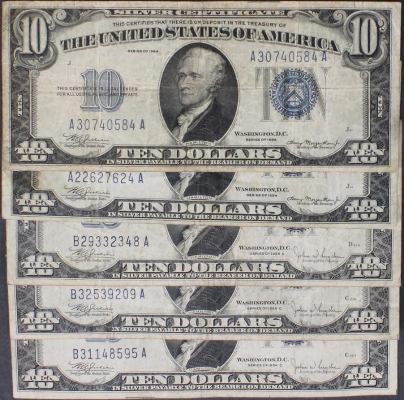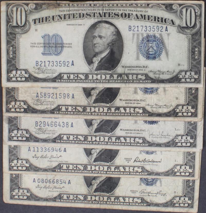 339 image (10) $10 Silver Certificates 1934 to 1953A most avg circ VG to F+ and devoid of other defects like ink and tears. (Image) (imageb) (All Images)