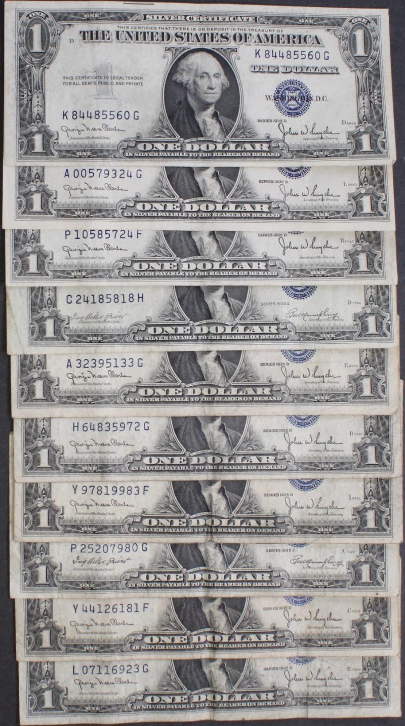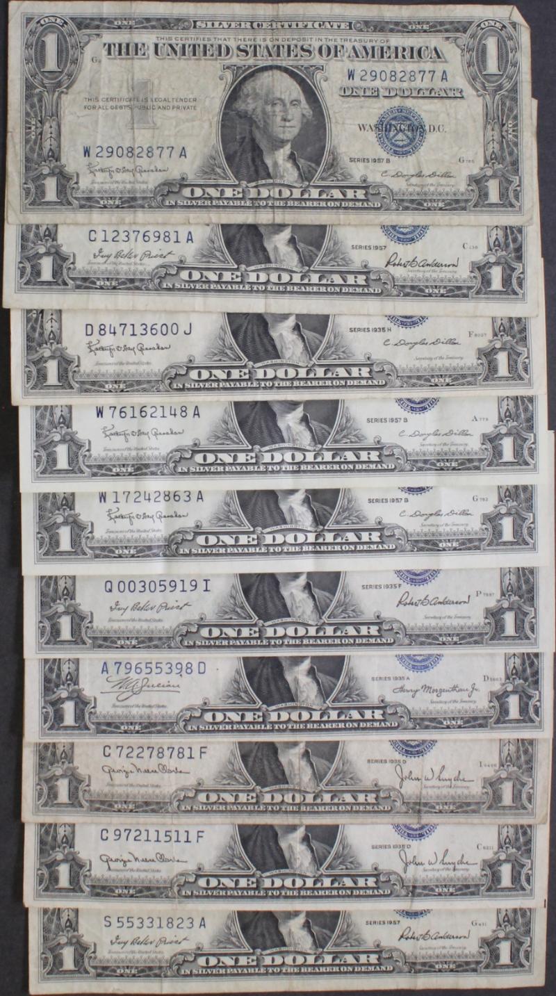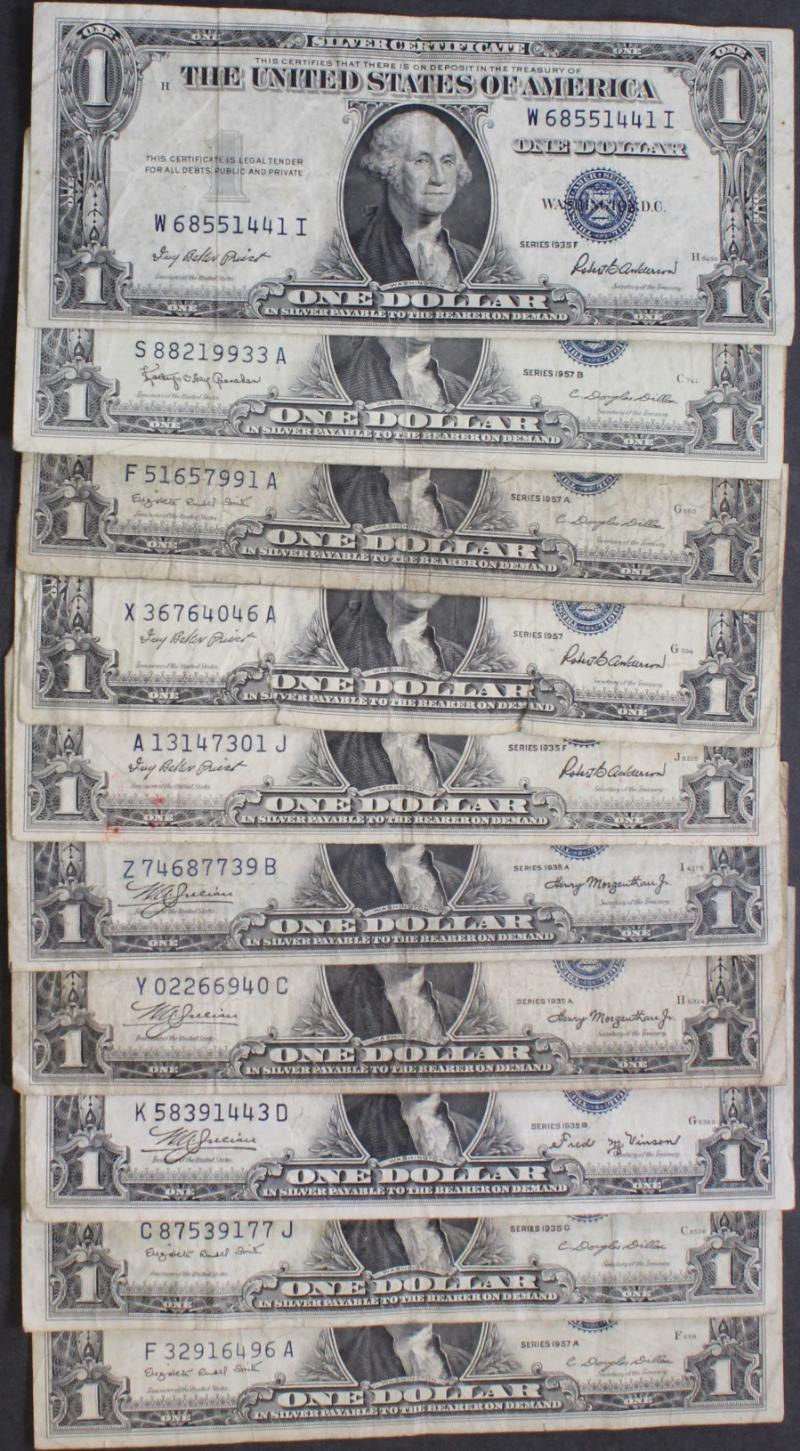 339 image (10) $10 Silver Certificates 1934 to 1953A most avg circ VG to F+ and devoid of other defects like ink and tears. (Image) (imageb) (All Images)
