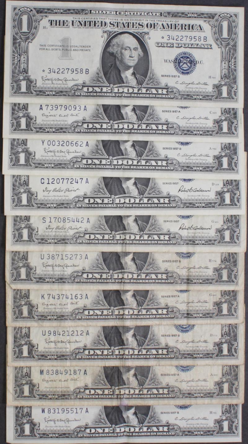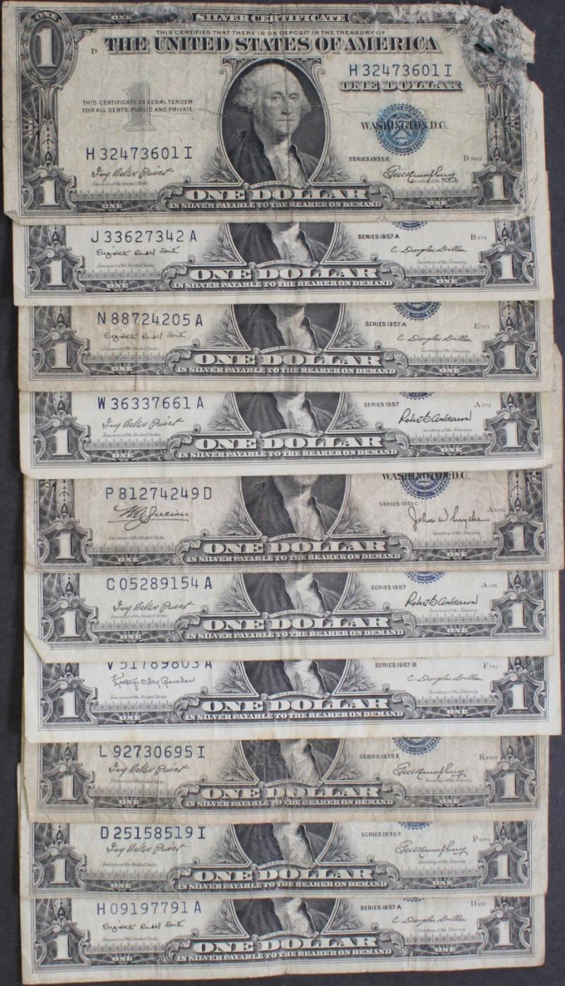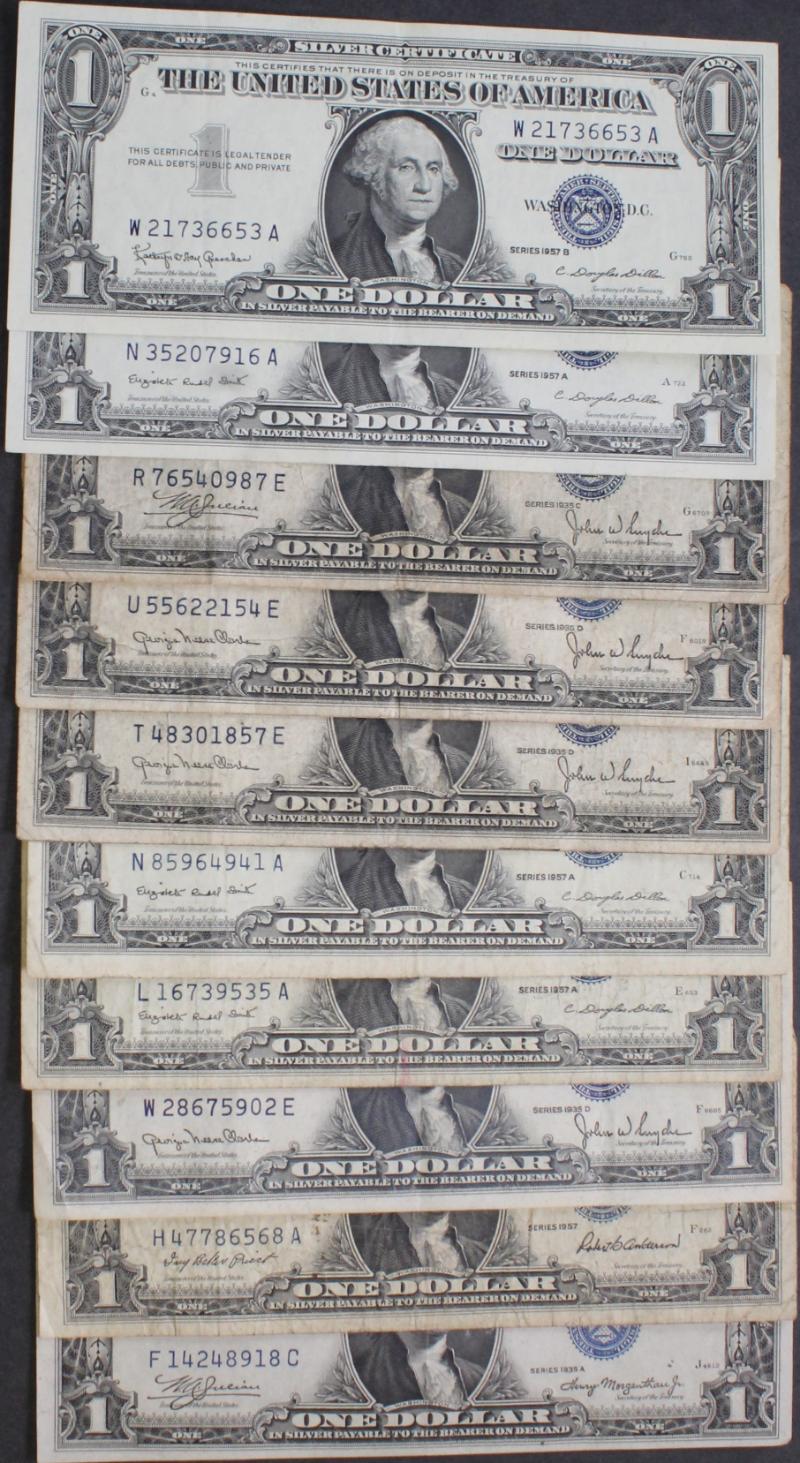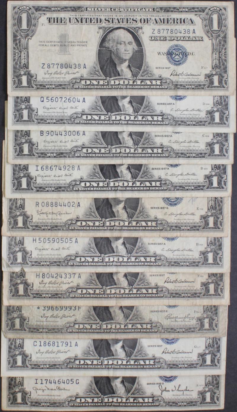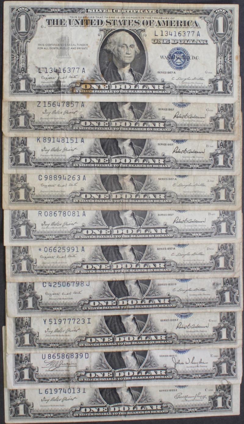 336 image (100) $1 Silver Certificates 1935x to 1957B avg circ most VG to XF, plus a few stars mixed in. (Image) (imageb) (imagec) (imaged) (imagee) (imagef) (imageg) (imageh) (imagei) (imagej) (All Images)