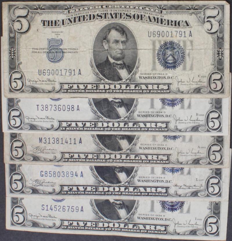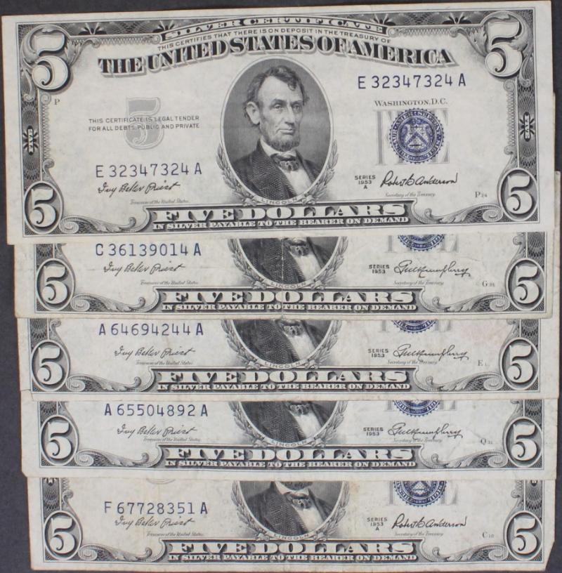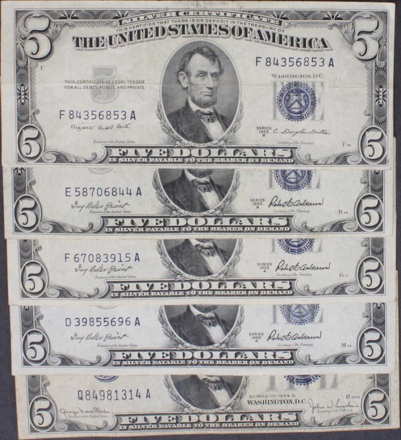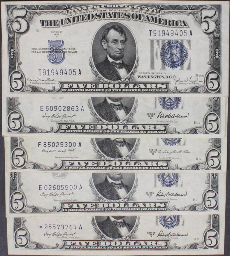 338 image (20) $5 Silver Certificates 1934A to 1953B most F to XF and attractive. (Image) (imageb) (imagec) (imaged) (All Images)