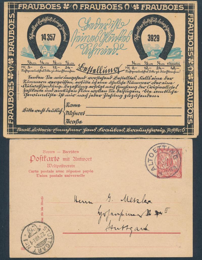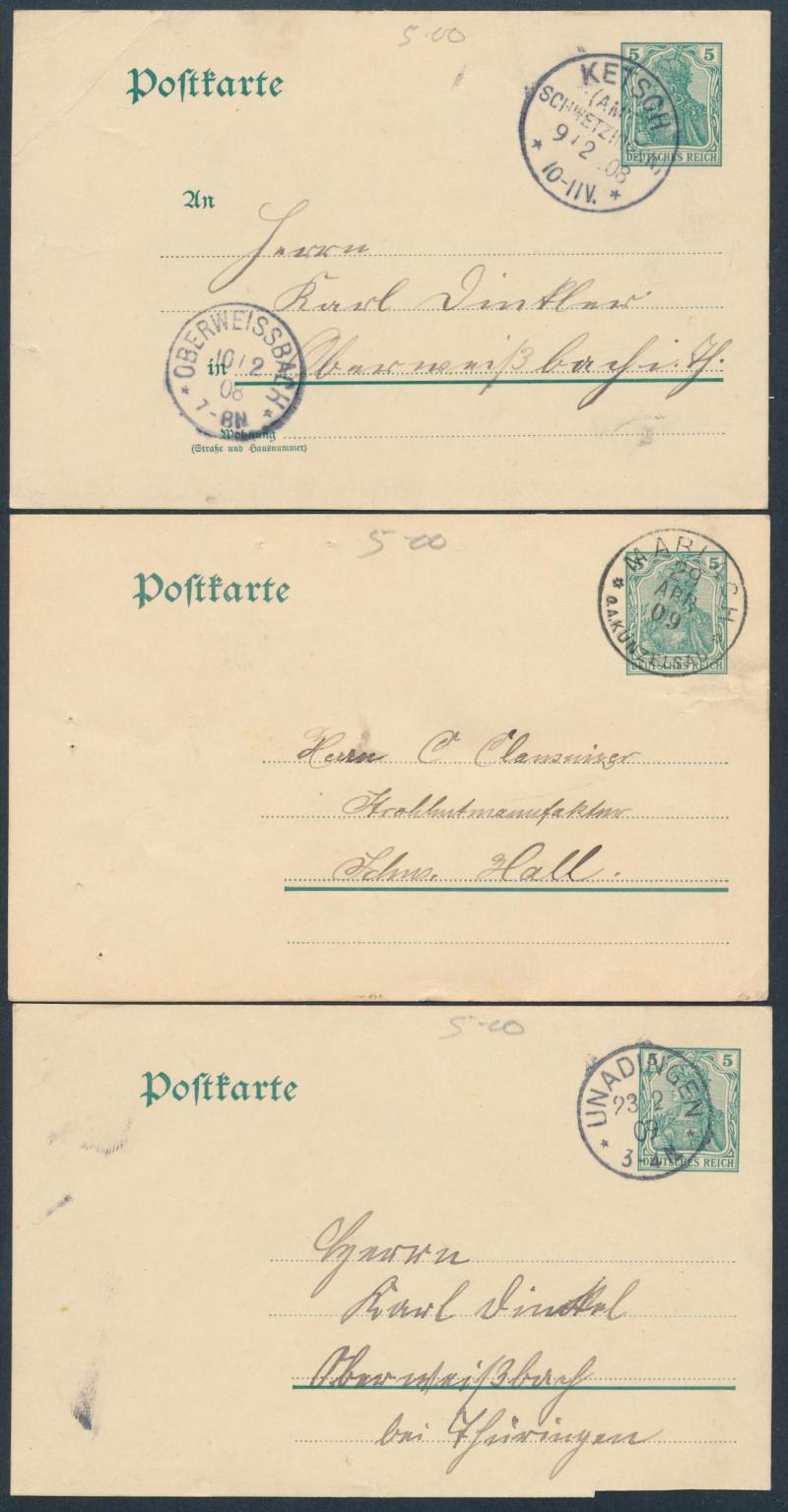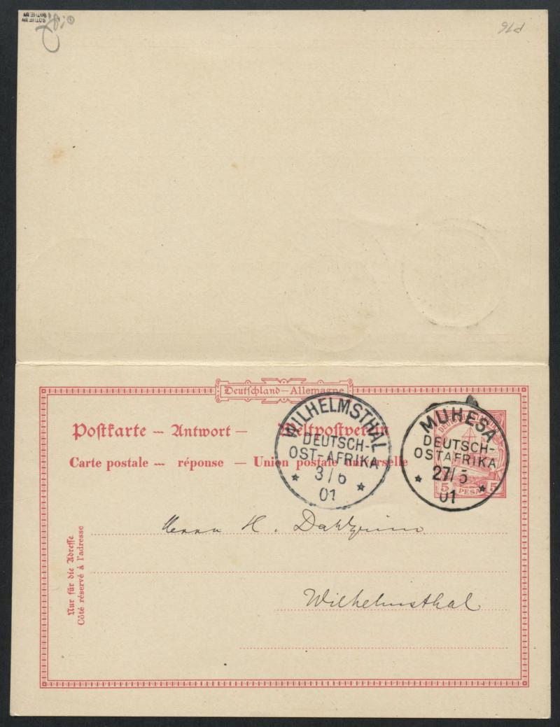 cds, superb 'MOSCHI/22 4/01/***' transit and 'WILHELMSTHAL/ DEUTSCHE/ OST-AFRIKA/11 5/01' arrival cds, the reply-half with superb 'MUHESA' cds. Marangu (1) PO 29.6.1895; closed -4.1898; Marangu (2) -.5.1900; closed 18.5.1901. Rare usage at Marangu