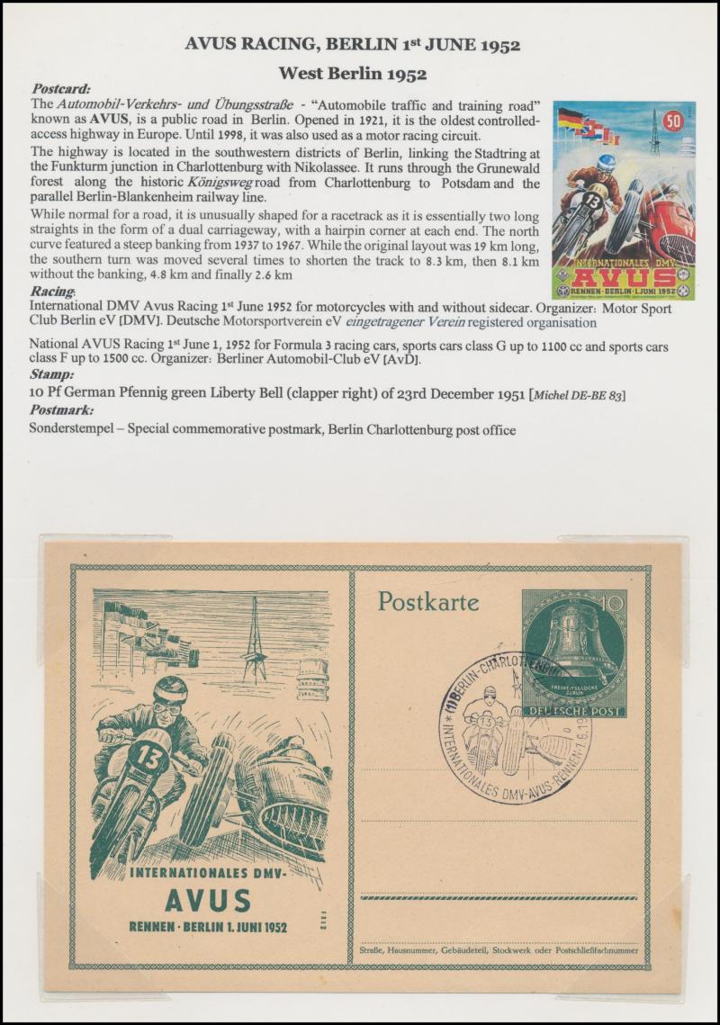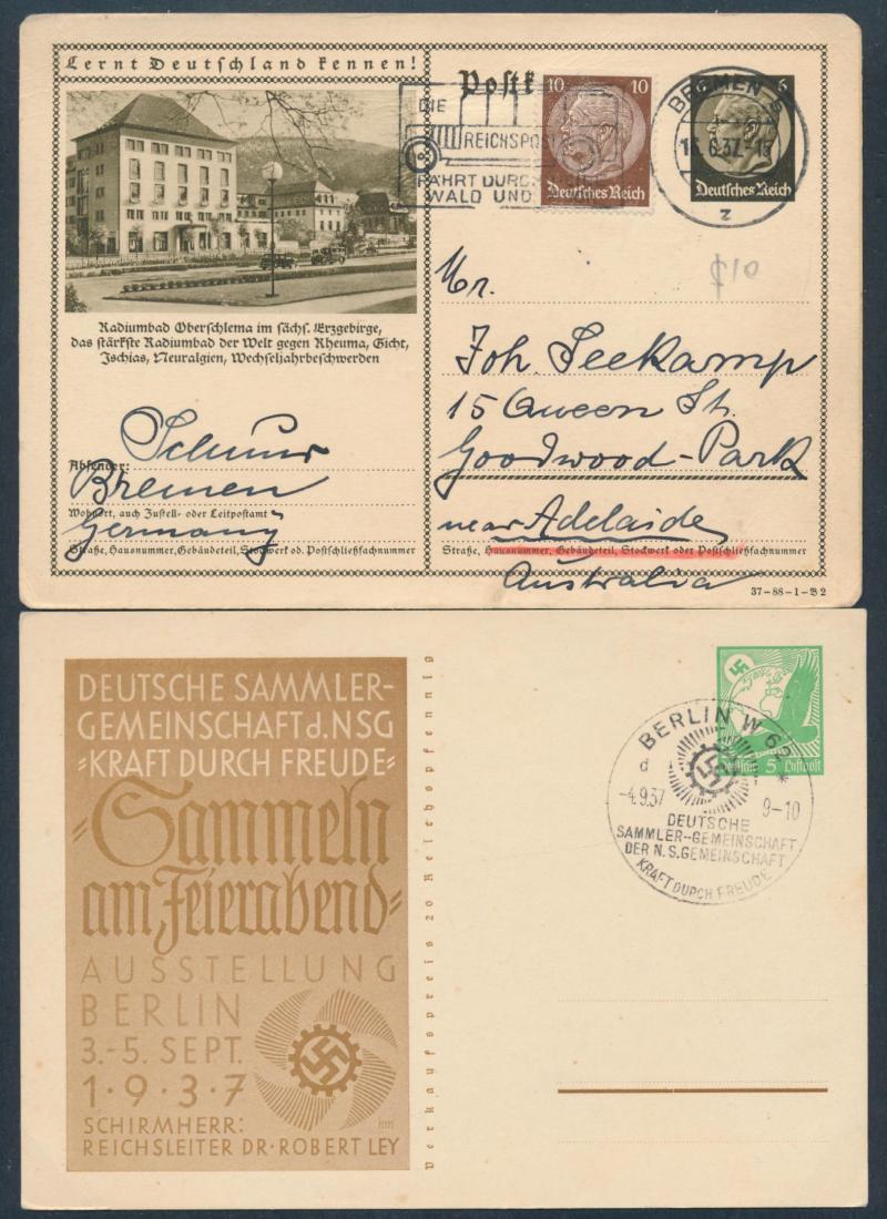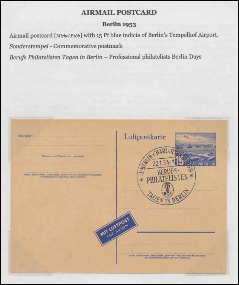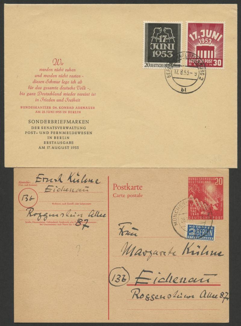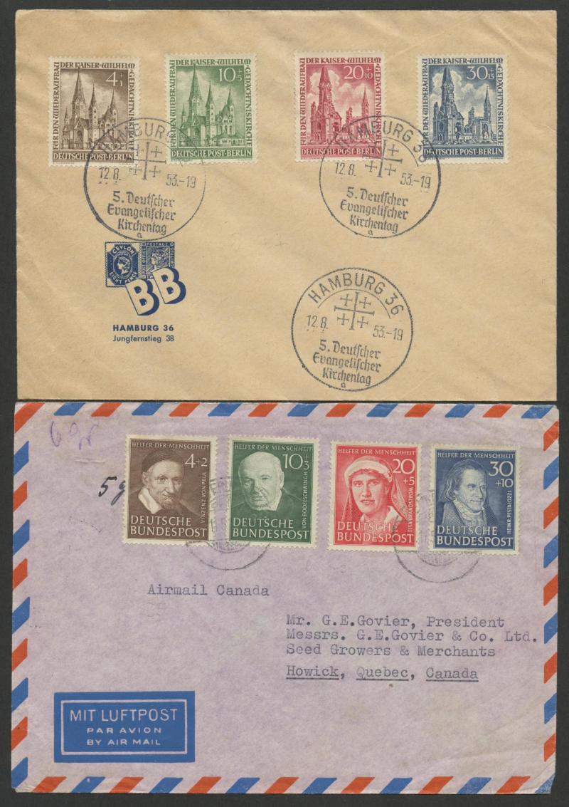 Parliament 10pf & 20pf Postal Cards used, illustrated FDCs for 1951 Exhibition, 1953 IFRABA & 1955 Relief Fund; also West Berlin 1950 commercial airmail to Chile with ERP 20pf x4, 1952 to Canada with combination franking of West Berlin Furtwangler x3