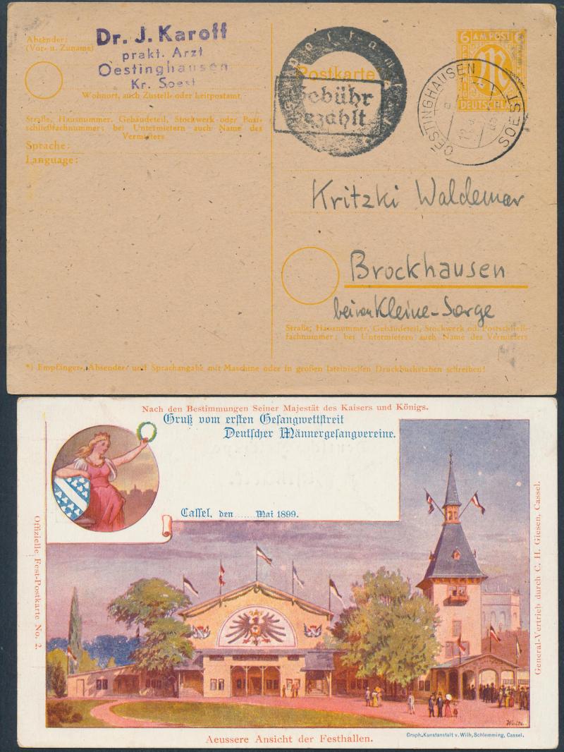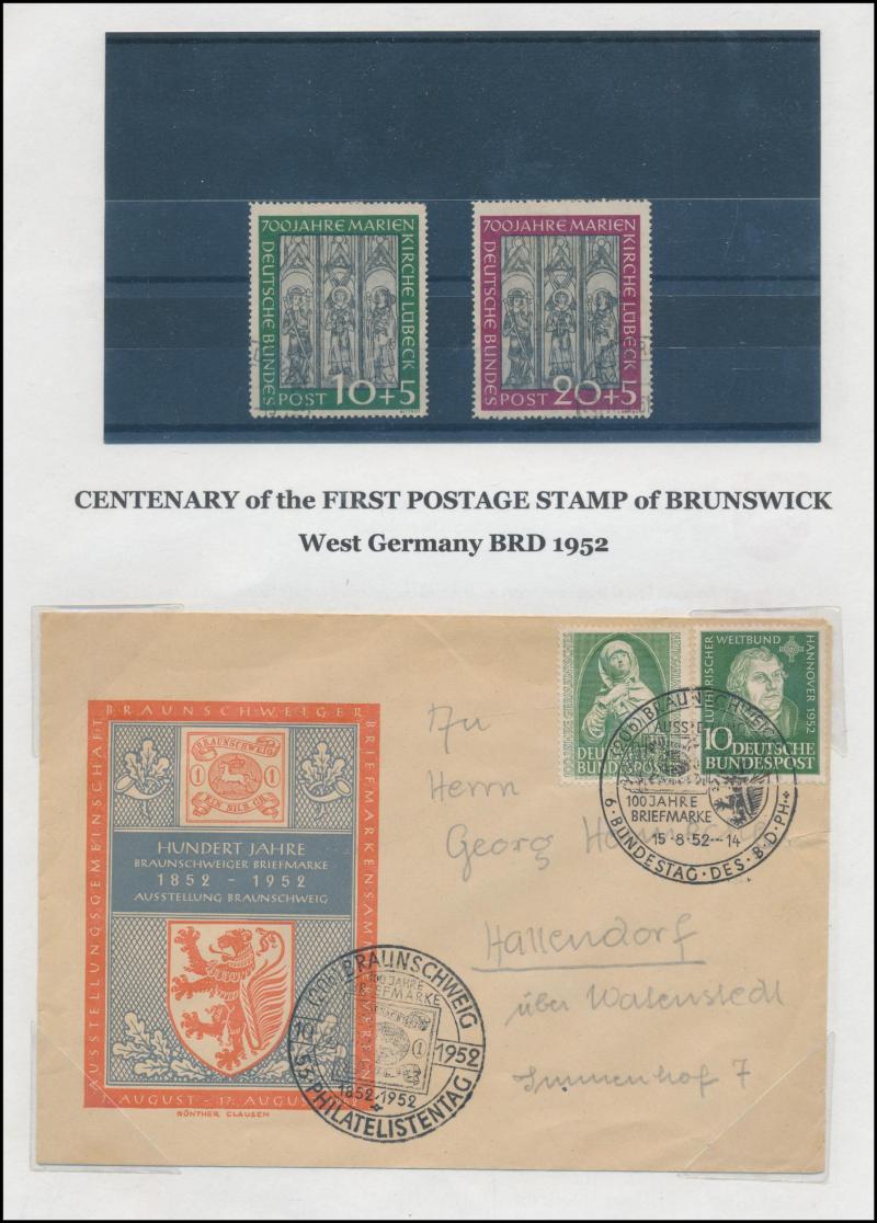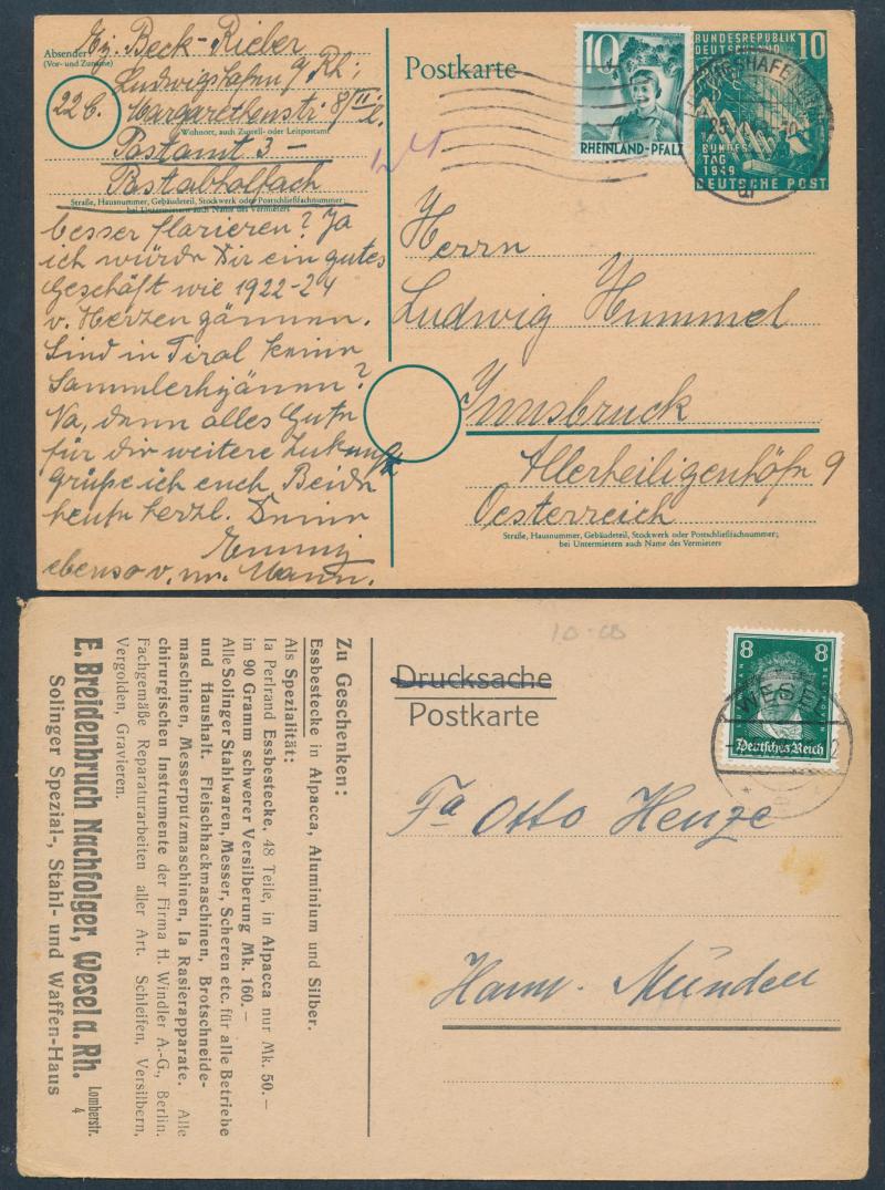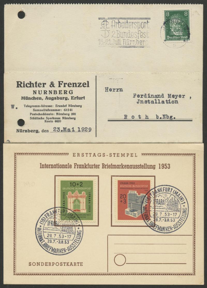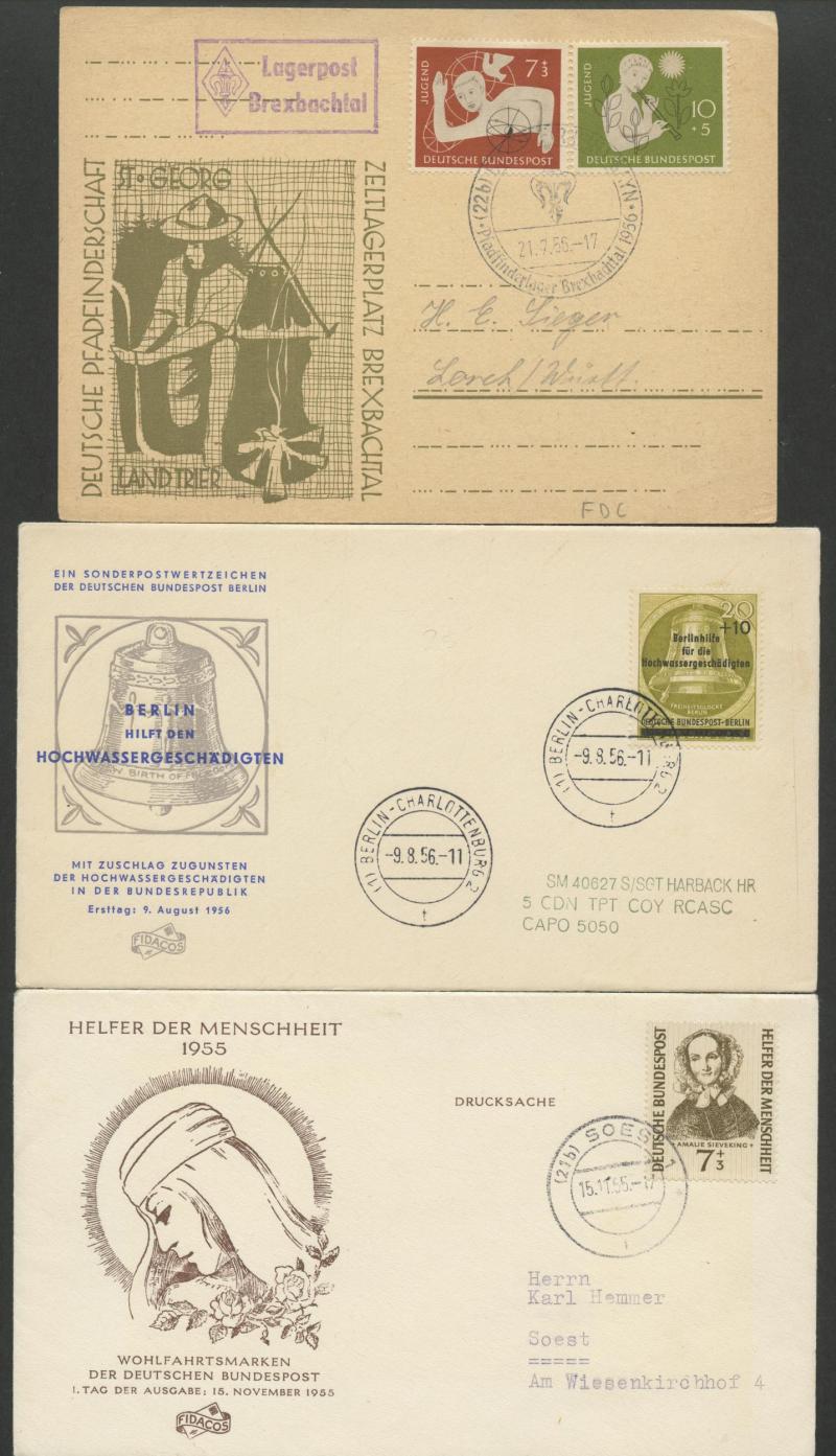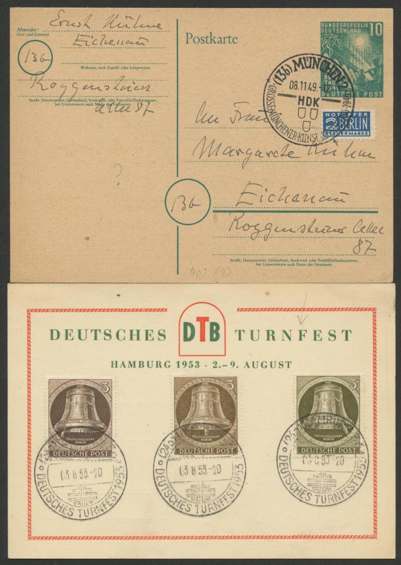 stationery, picture postcards, flight covers, commercial mail, etc. Among the many better items we noted West Germany 1951 Lübeck Church duo used and 1952 Youth duo on illustrated FDC; West Berlin 1950 ERP 20pf on commemorative postcard; East Germany