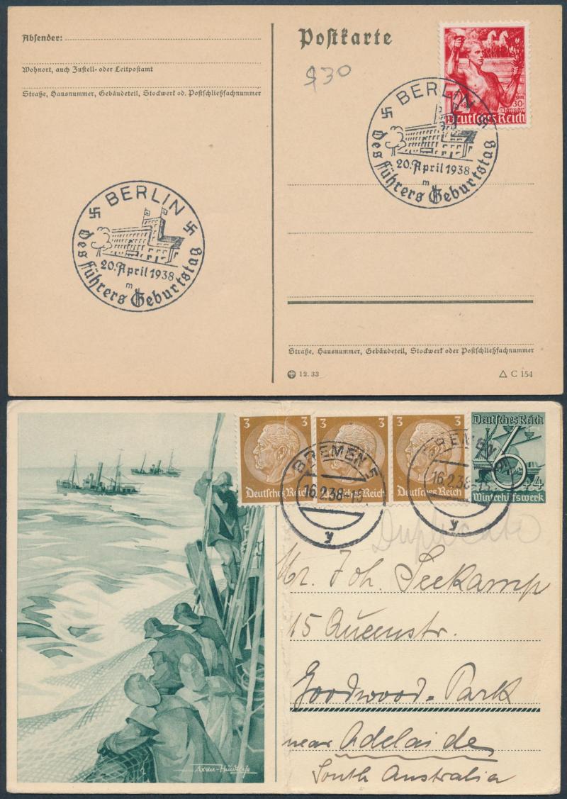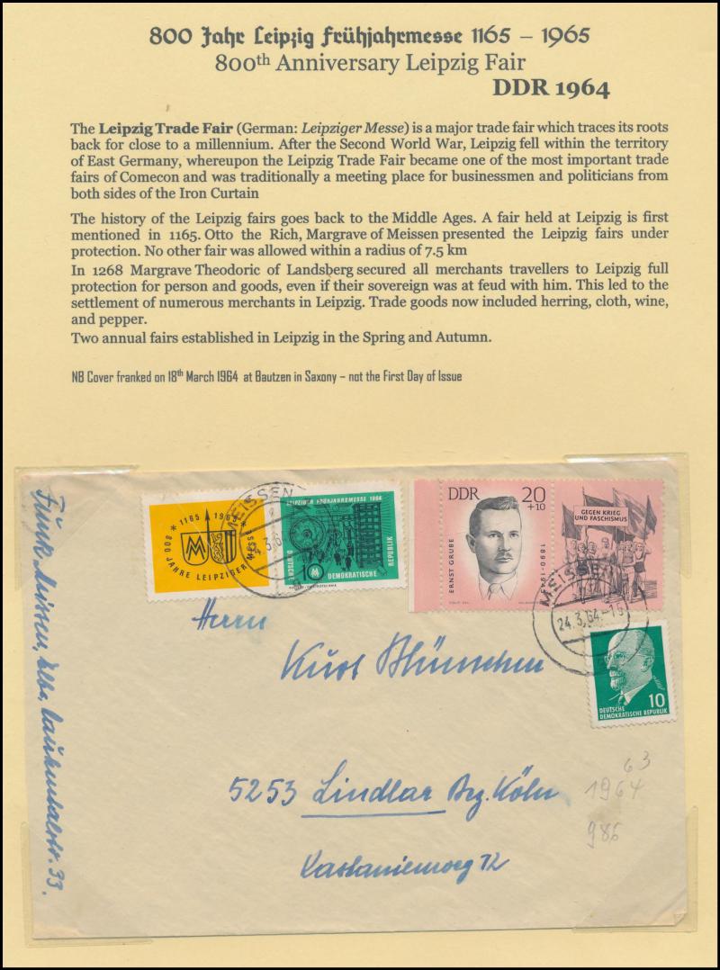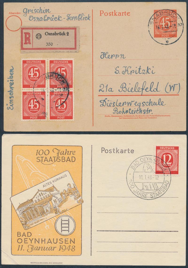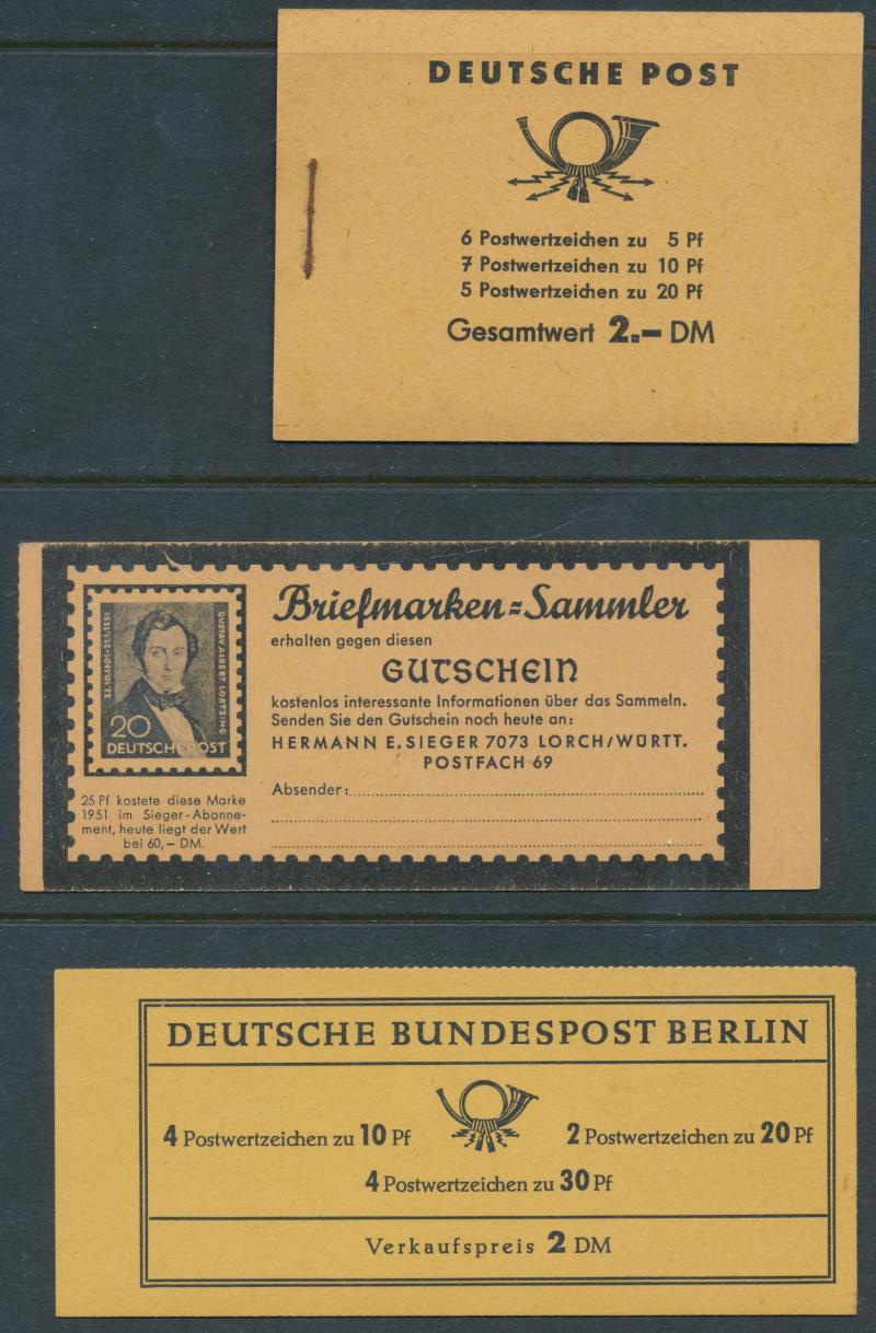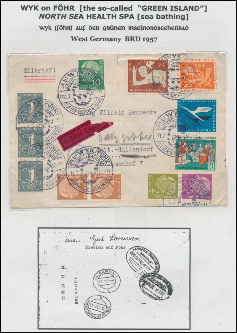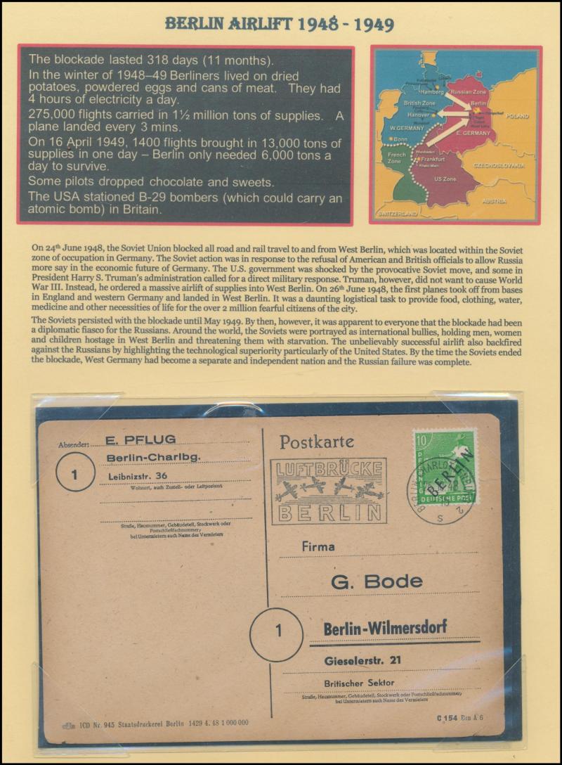 stationery, picture postcards, flight covers, commercial mail, etc. Among the many better items we noted West Germany 1951 Lübeck Church duo used and 1952 Youth duo on illustrated FDC; West Berlin 1950 ERP 20pf on commemorative postcard; East Germany