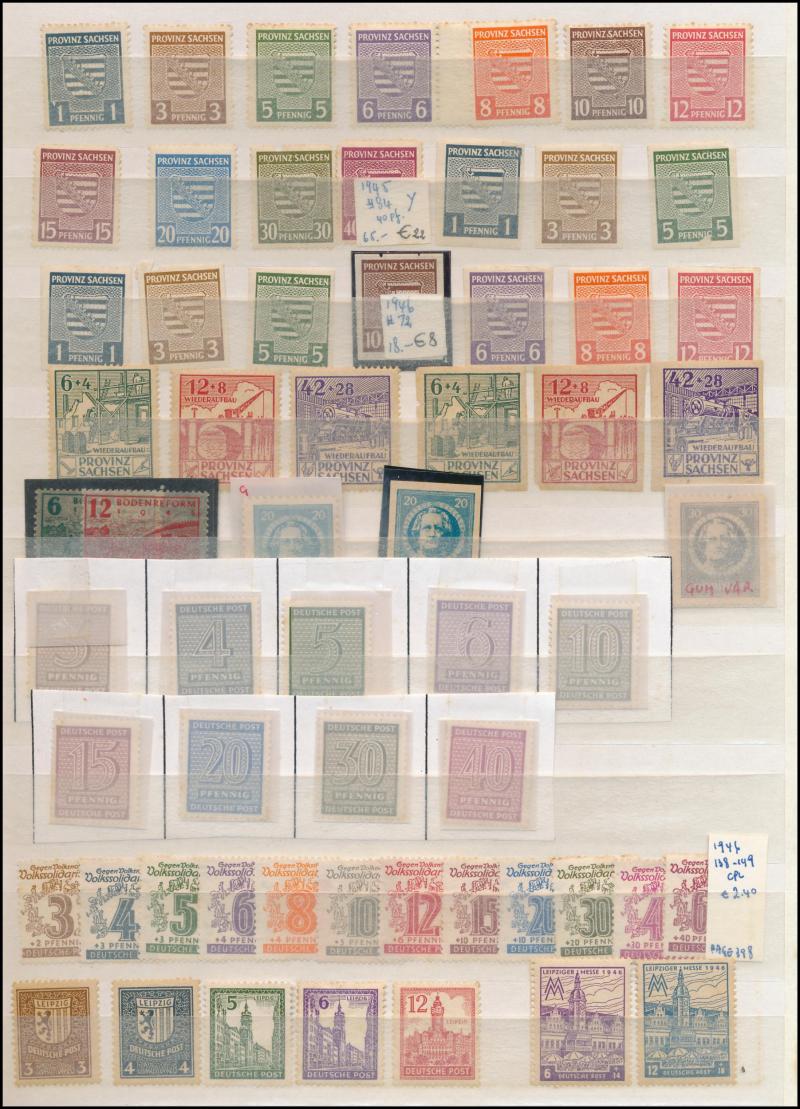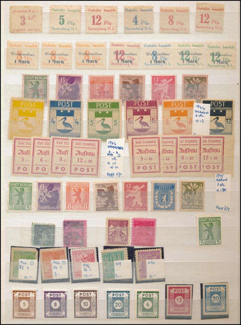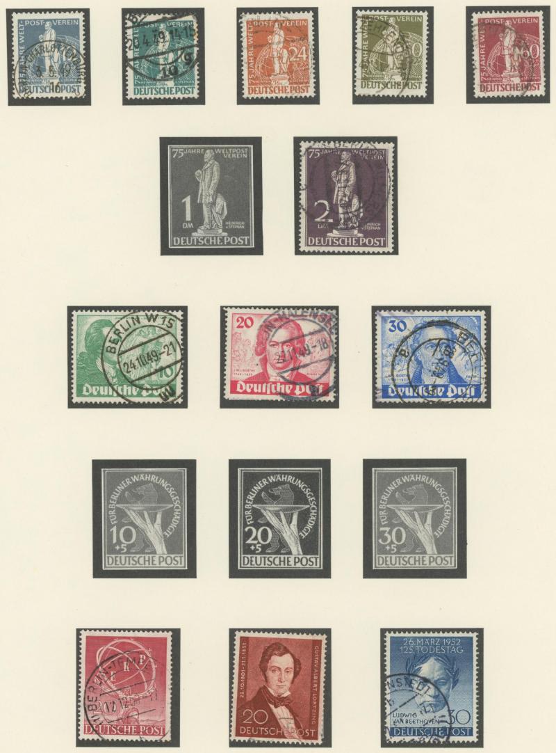 range including 25pf used (minor crease) and 3m & 5m * (none expertised), 1949 UPU Stephan 12pg,16pg & 2m used, Buildings set used (1pg *) and Goethe set used then predominantly mint/** including 1949 Green Surcharges set, 1950 Philharmonic duo &
