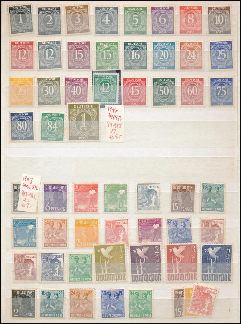 including 15pf 25pf 84pf & 1mk (minor crease) and Red Overprints set to 80pf (none expertised), 1949 UPU Stephan, Buildings, Goethe & Green Surcharges sets, 1950 Philharmonic duo & Stamp Day duo, 1951-53 Bells complete ex 30pf Clapper Left, 1952