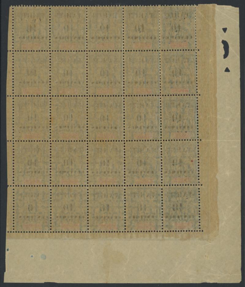 POLYNESIA: 1903 'TAHITI/10/CENTIMES' overprint on Peace & Commerce 15c blue SG 57 marginal block of 25 (5x5) being the lower five
