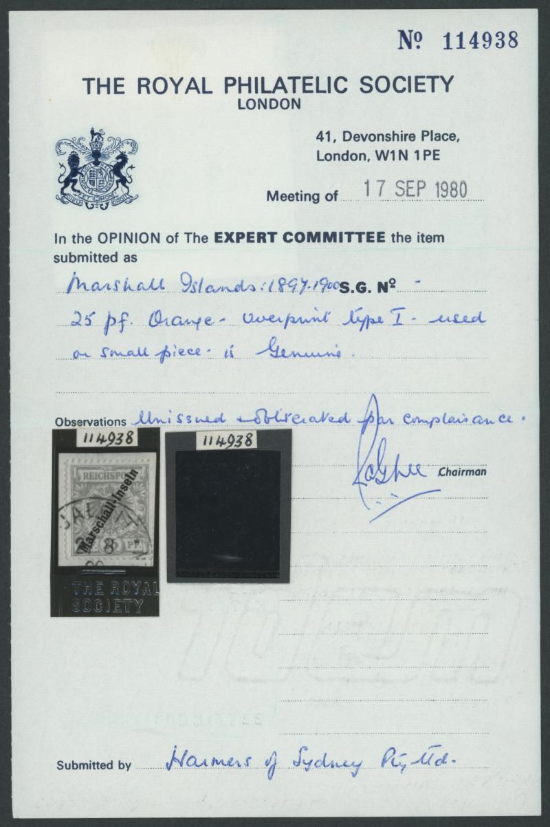 MARSHALL ISLANDS: 1899 'Marschall-Inseln' Overprints Berlin Issue 25pf orange Michel 5II (Scott 5; Gibbons unlisted) tied to small