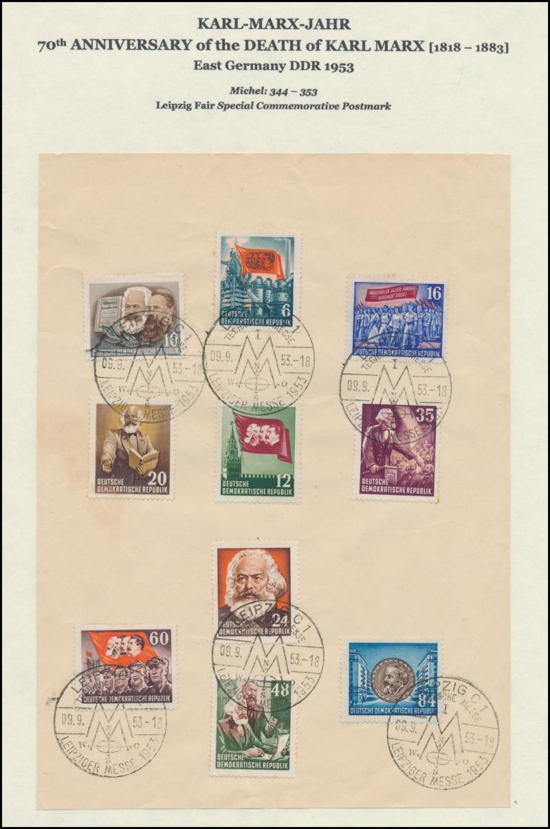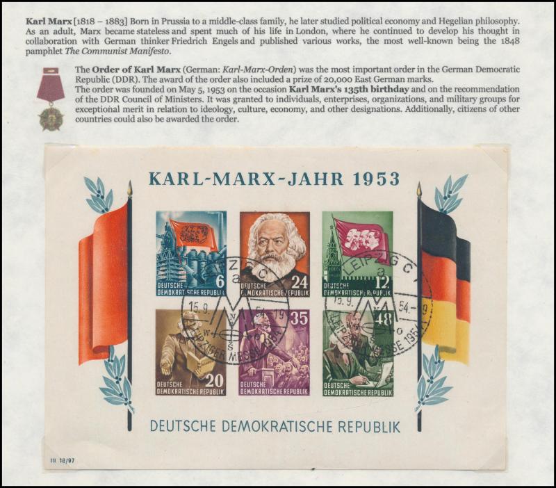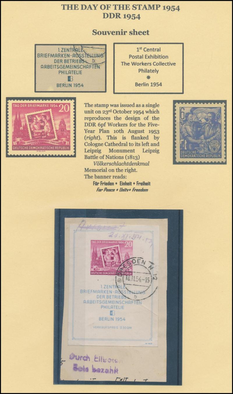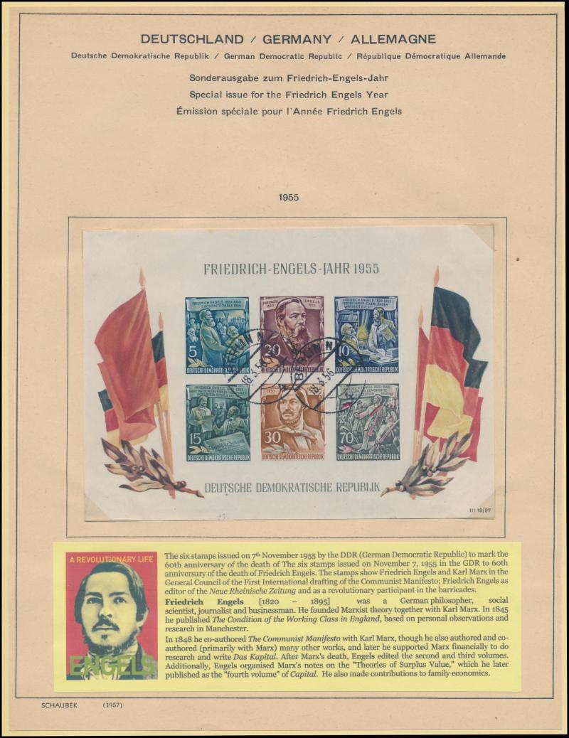 (DDR) 1949 UPU 30pf on FDC (aging marks), 1950 DEBRIA M/S CTO, 1951 China Friendship set unused, 1953 Marx M/Ss duo imperforate CTO, 1955 Engels M/S CTO; etc. Strength in the period up to Re-Unification with a few binders of later material, lots of