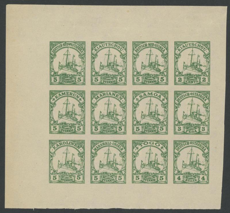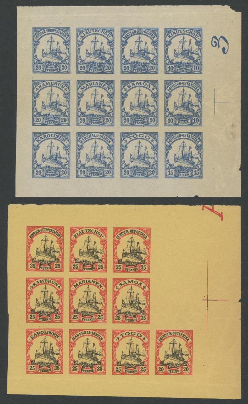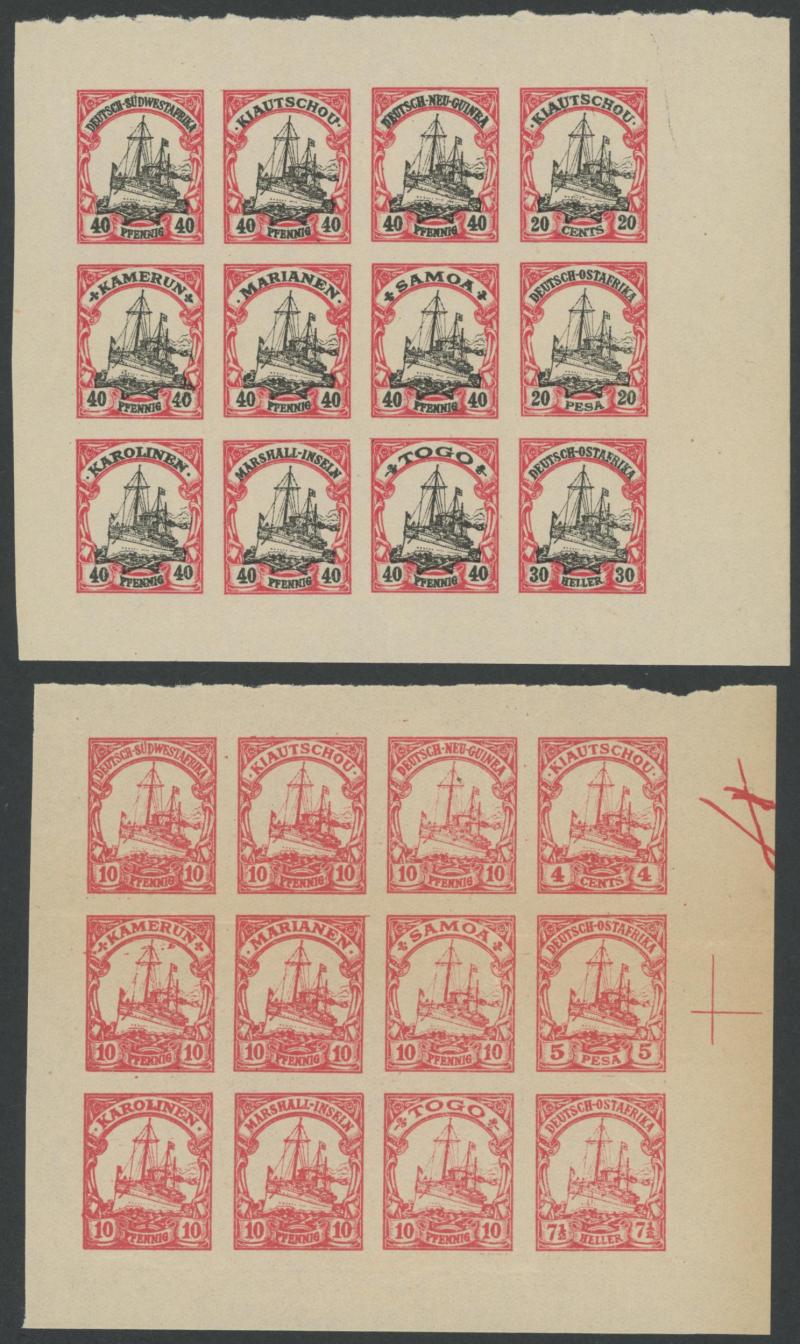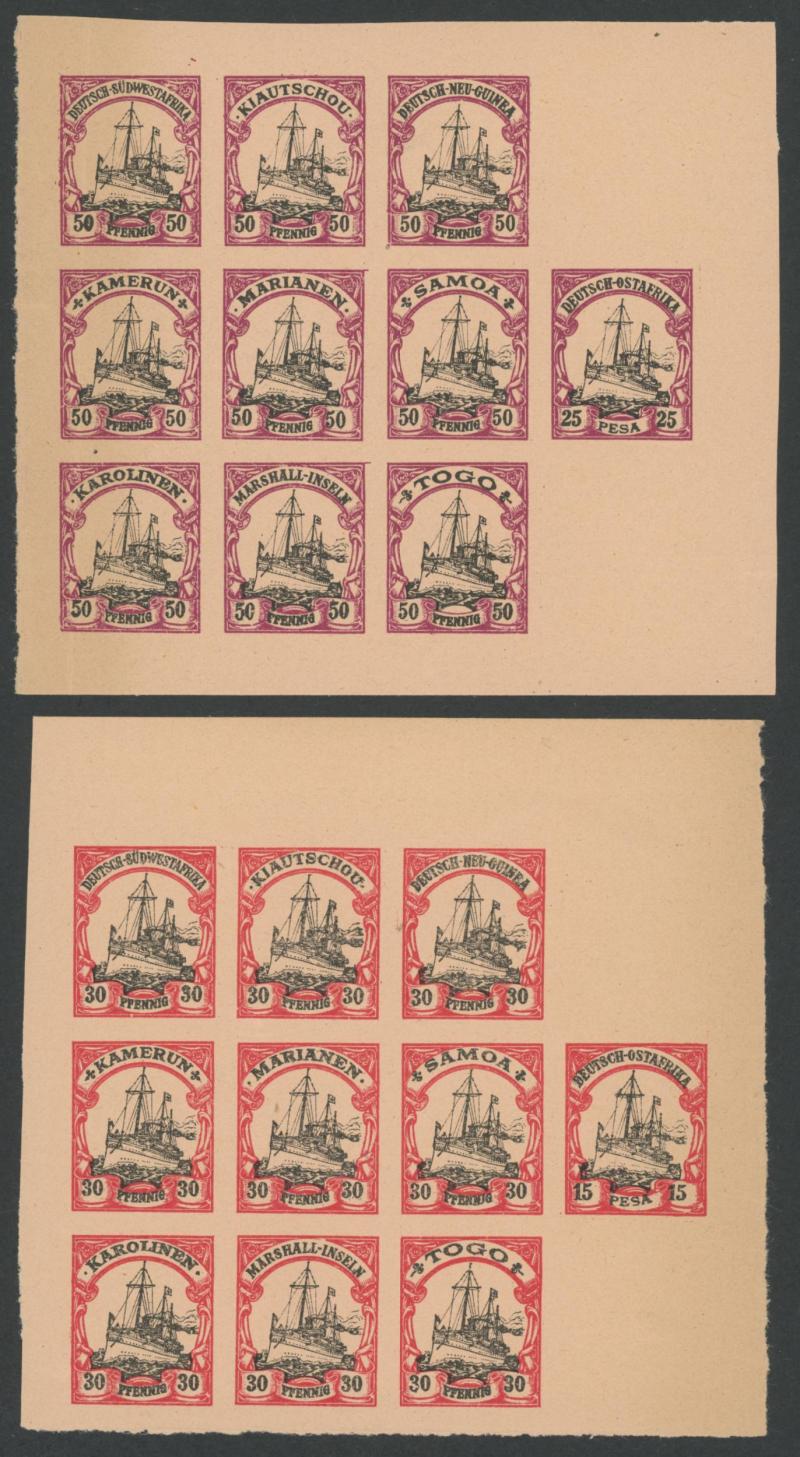 values for 10 only) plus Deutsch-Ostafrika 45pf sheetlet of 12, a few with minor bends, full unmounted gum. Scarce 'complete set' of these attractive fakes that don't run the risk of fooling anyone.