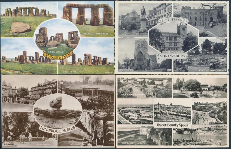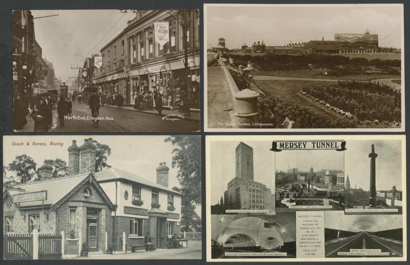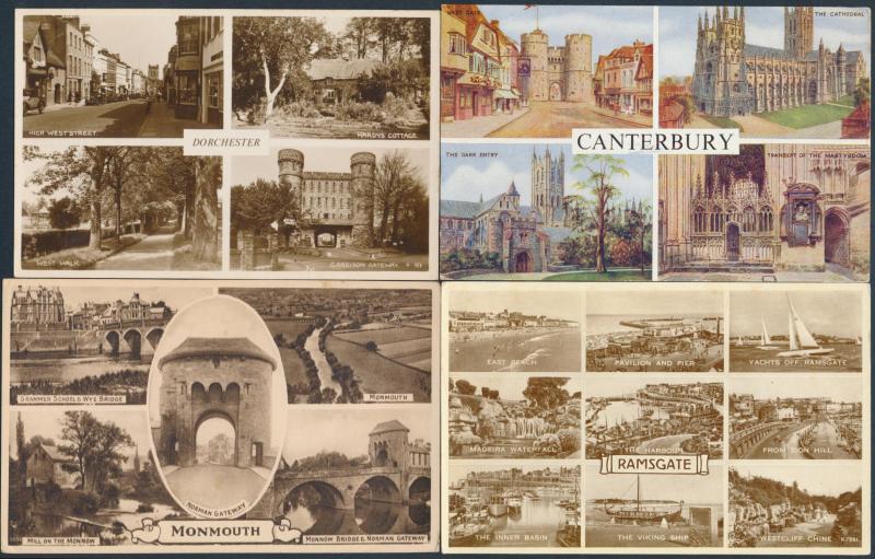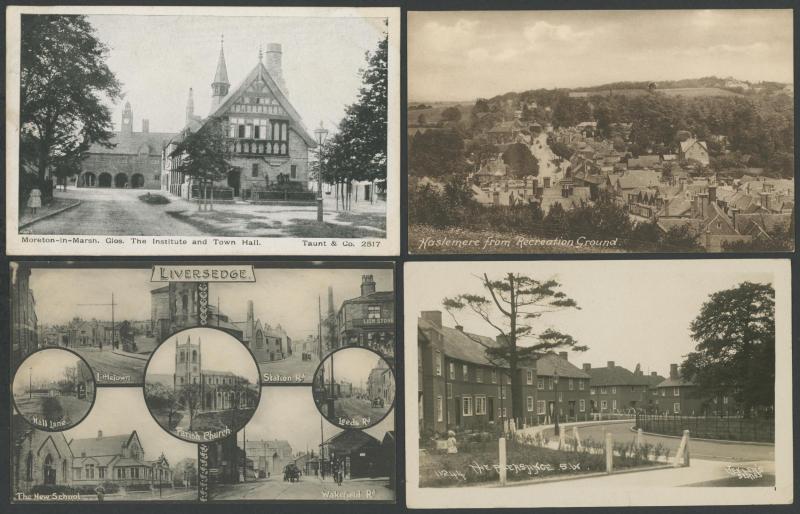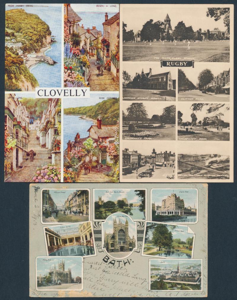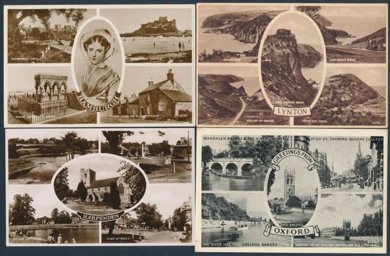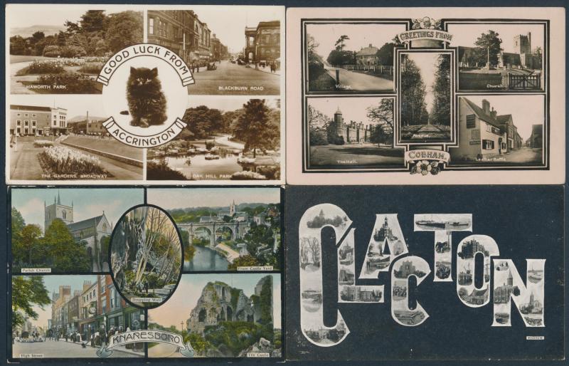 Pre-WWII multi-view cards including lesser-known places such as Calverley, Darwen, Seaford, Cobham, Trentham, Accrington,