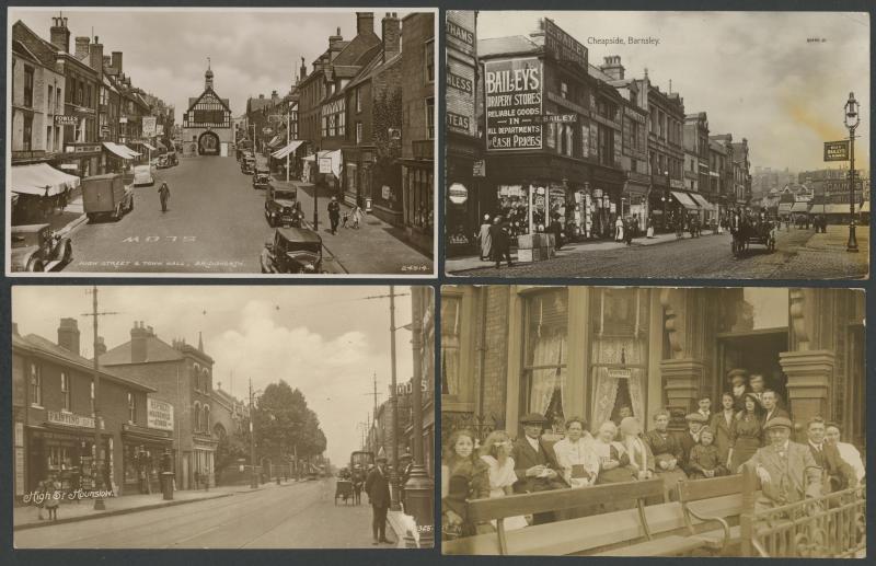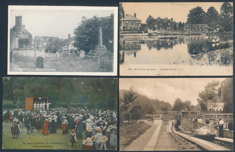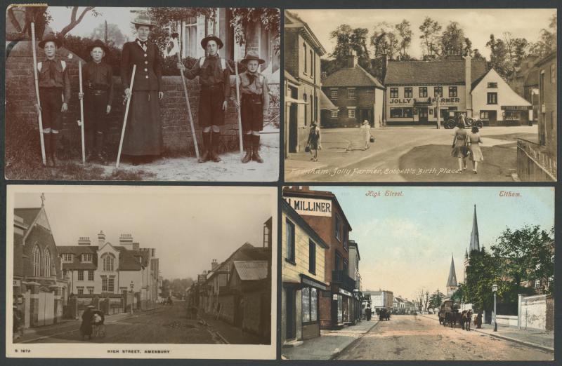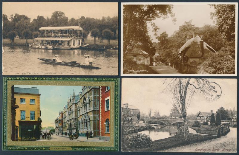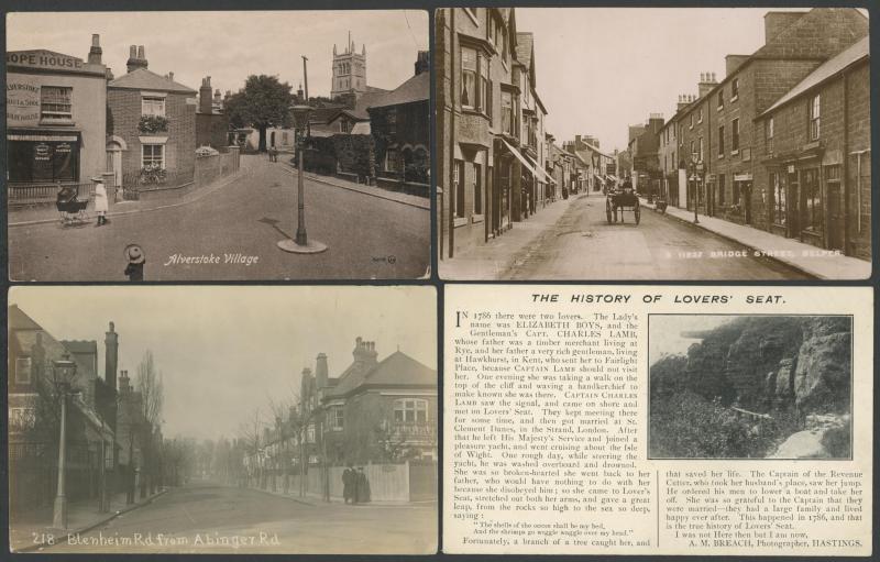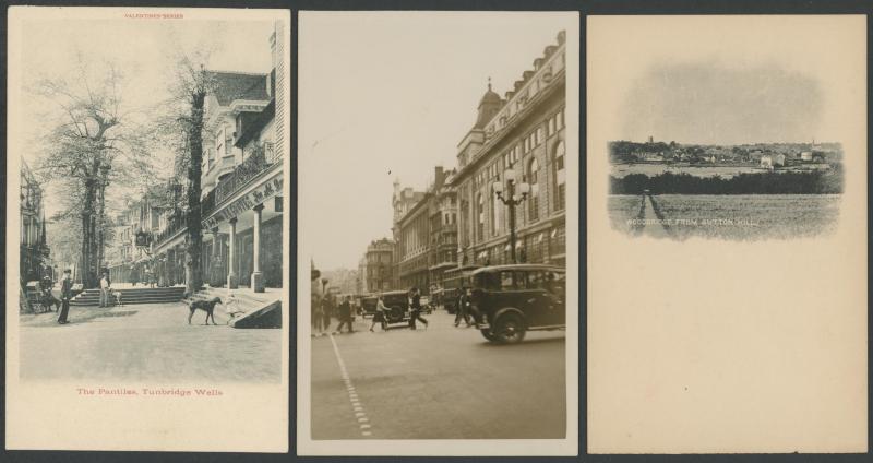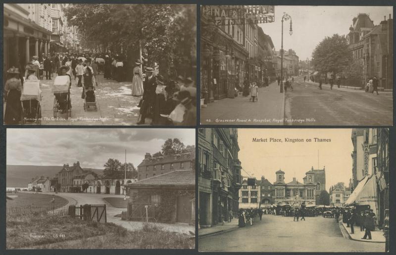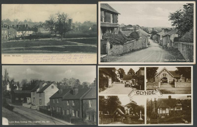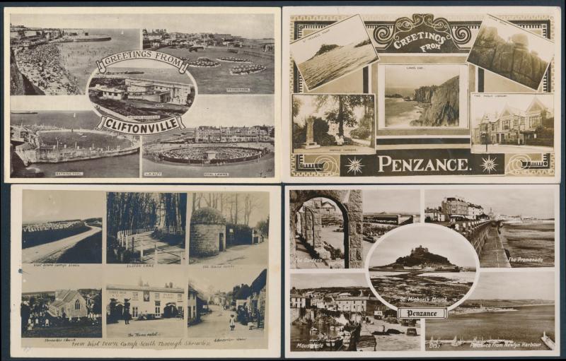 Pre-WWII multi-view cards including lesser-known places such as Calverley, Darwen, Seaford, Cobham, Trentham, Accrington,