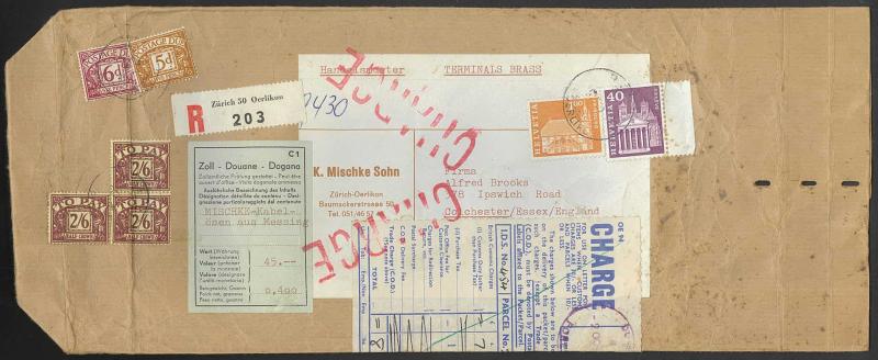 small Customs label declaring weight of 400g & value of SFr45, British 'CHARGE' label affixed, duty assessed at 7/5d + 1/- clearance fee and Postage Dues 5d 6d & 2/6d x3 (crossed by vertical fold) tied by light 'COLCHESTER' cds, minor blemishes.