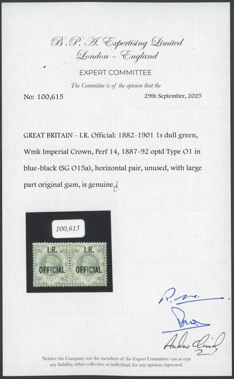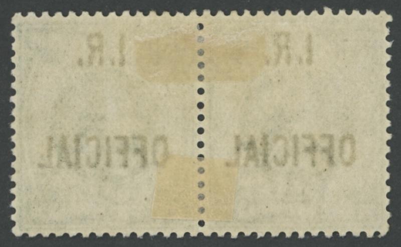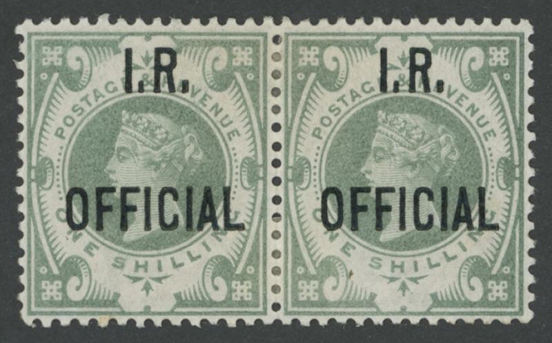 OFFICIAL STAMPS: 'I.R./OFFICIAL' overprints on QV 1883 1/- green SG O15 horizontal pair, well-centred, reinforced perf separation,