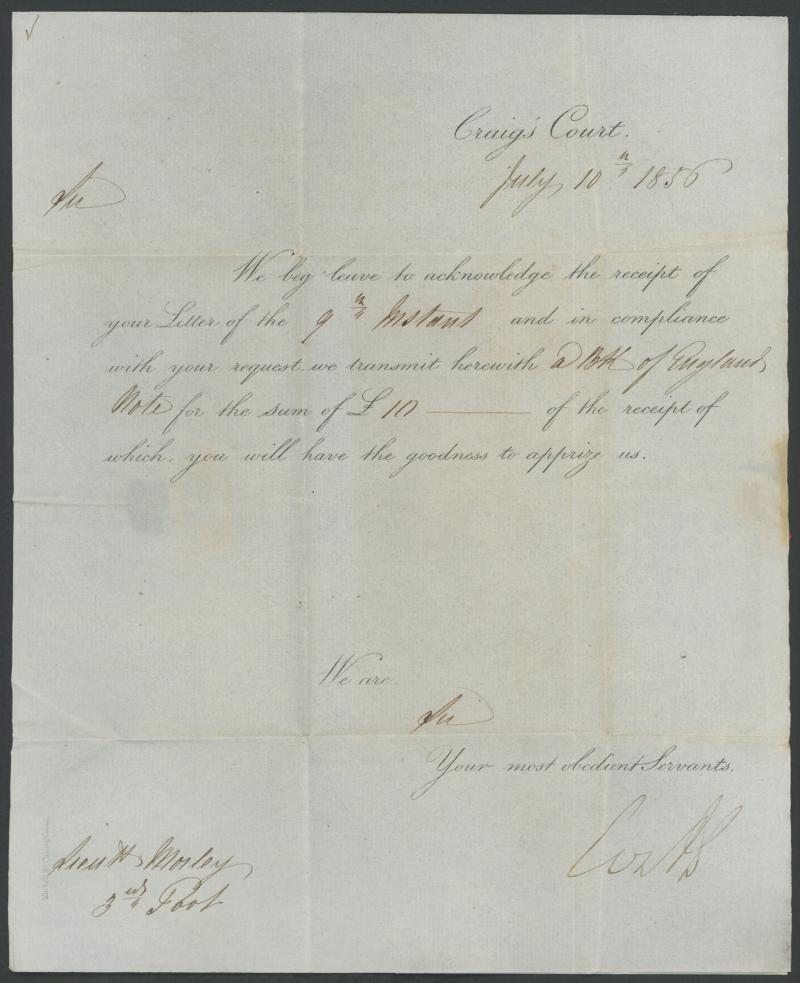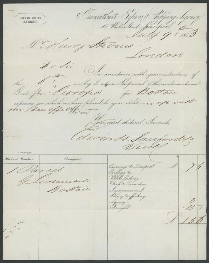 1853 (July 9) Transatlantic Express & Shipping Agency, Liverpool consignee note for shipment to Boston, USA entire to London with