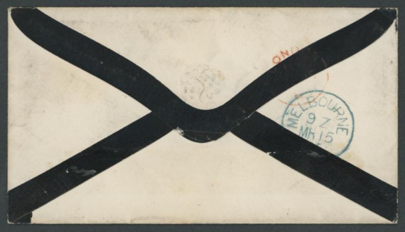 Printed Small Corner Letters 4d red x2 tied by Dublin-186 duplex cancels, London transit of the same day on the face, Melbourne 'MR15/65' arrival cds in blue on the reverse. Carried by 'Ellora' departing Marseilles 28.1.1865 to Alexandria and