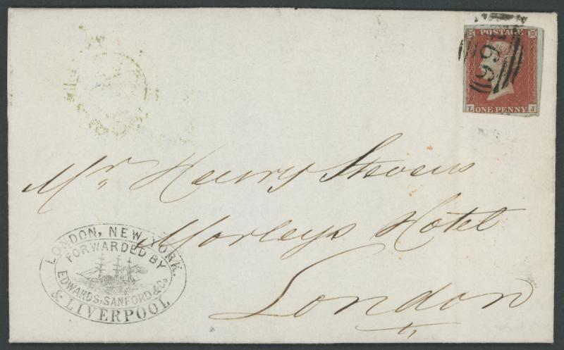 very fine strike of 'FORWARDED BY/[sailing ship]/EDWARDS, SANFORD & CO/LONDON, NEW YORK/& LIVERPOOL' cachet at lower-left and QV Line Engraved 1d red-brown imperforate (margins just touching at lower-left to large) tied by Barred Numeral '466' cancel