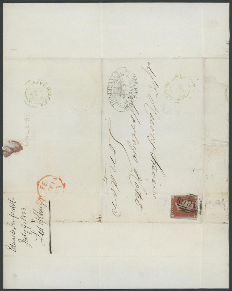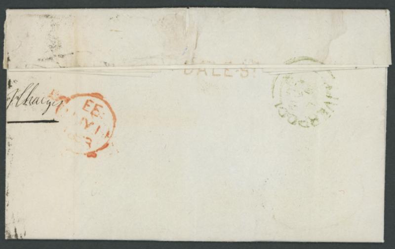 with Liverpool 'DALE-ST' straight-line sub-office handstamp, Liverpool unframed cds in green & London '11JY11/1853' arrival in red on the reverse, vertical fold clear of the adhesive & largely clear of the markings. Ex John Barwis. (Image1) (Image2)